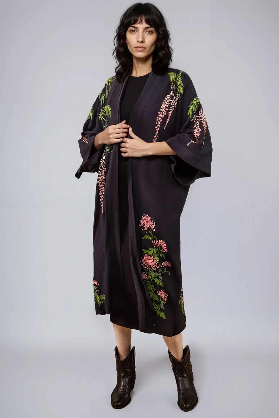 ARTEMIS MUSE EMBROIDERED LONG KIMONO VINTAGE WISTERA AND PEONY BLACK