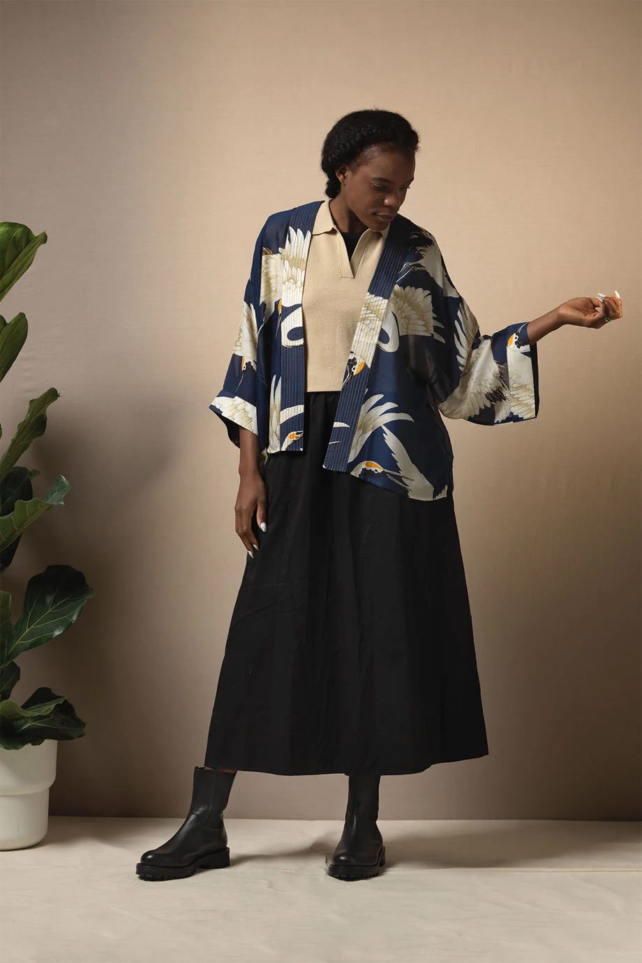 ONE HUNDRED STARS CREPE KIMONO CRANE BLACK