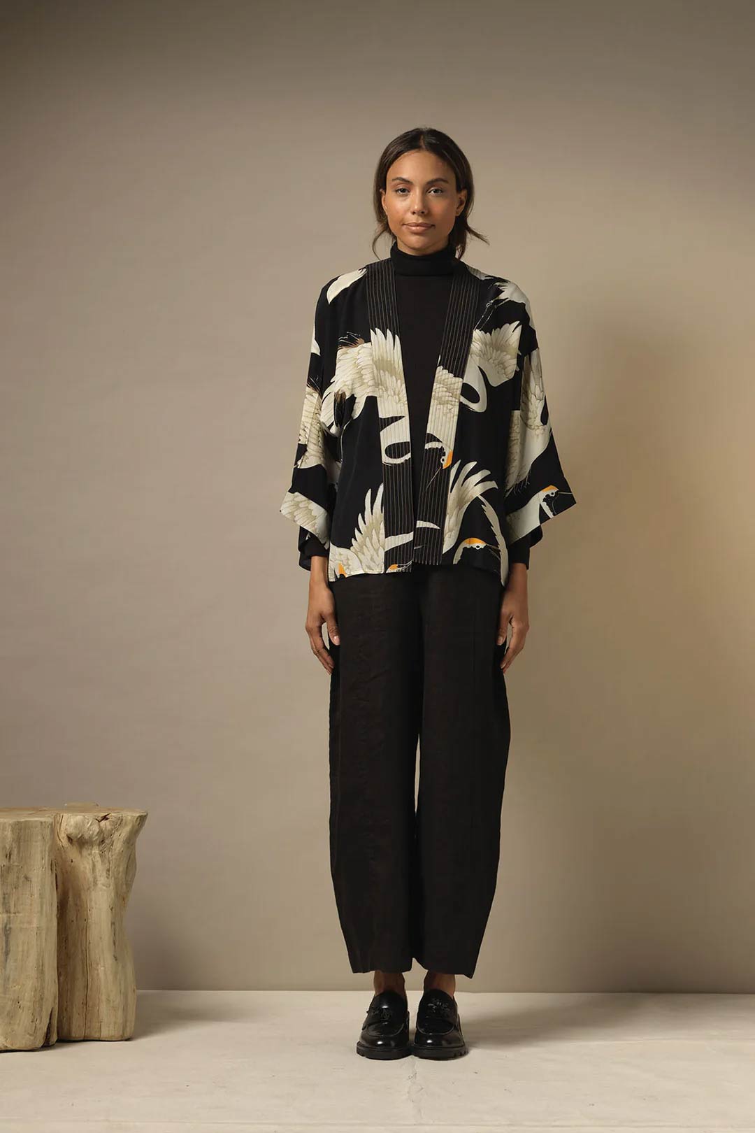 ONE HUNDRED STARS CREPE STORK BLACK KIMONO