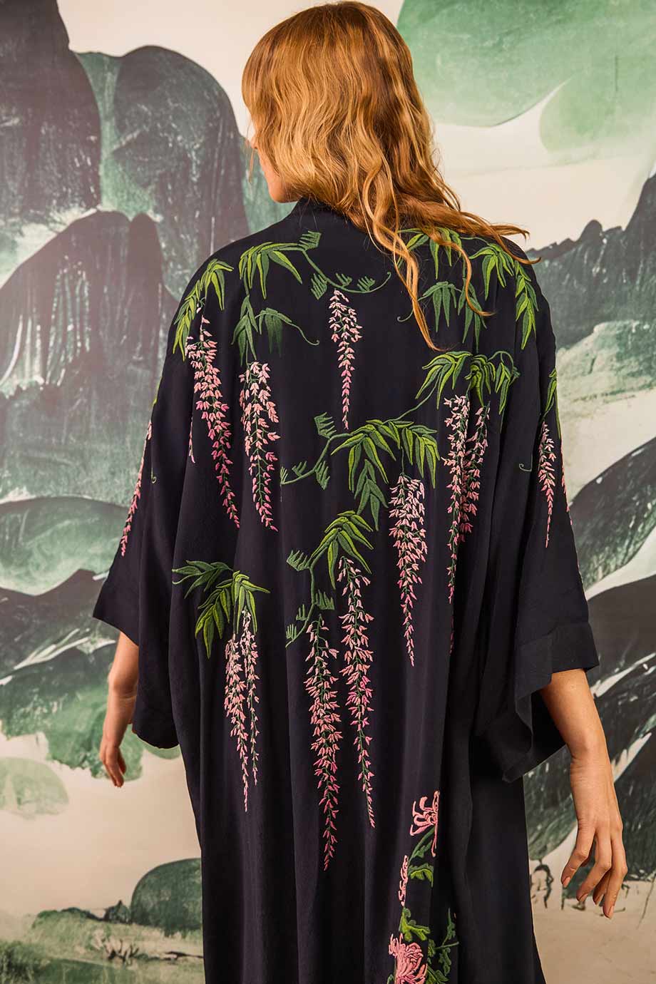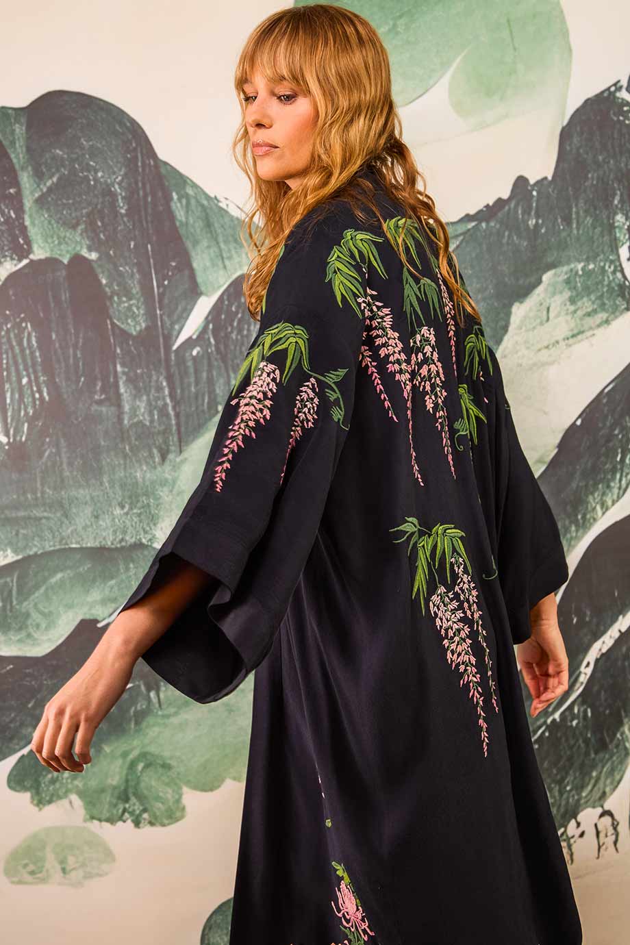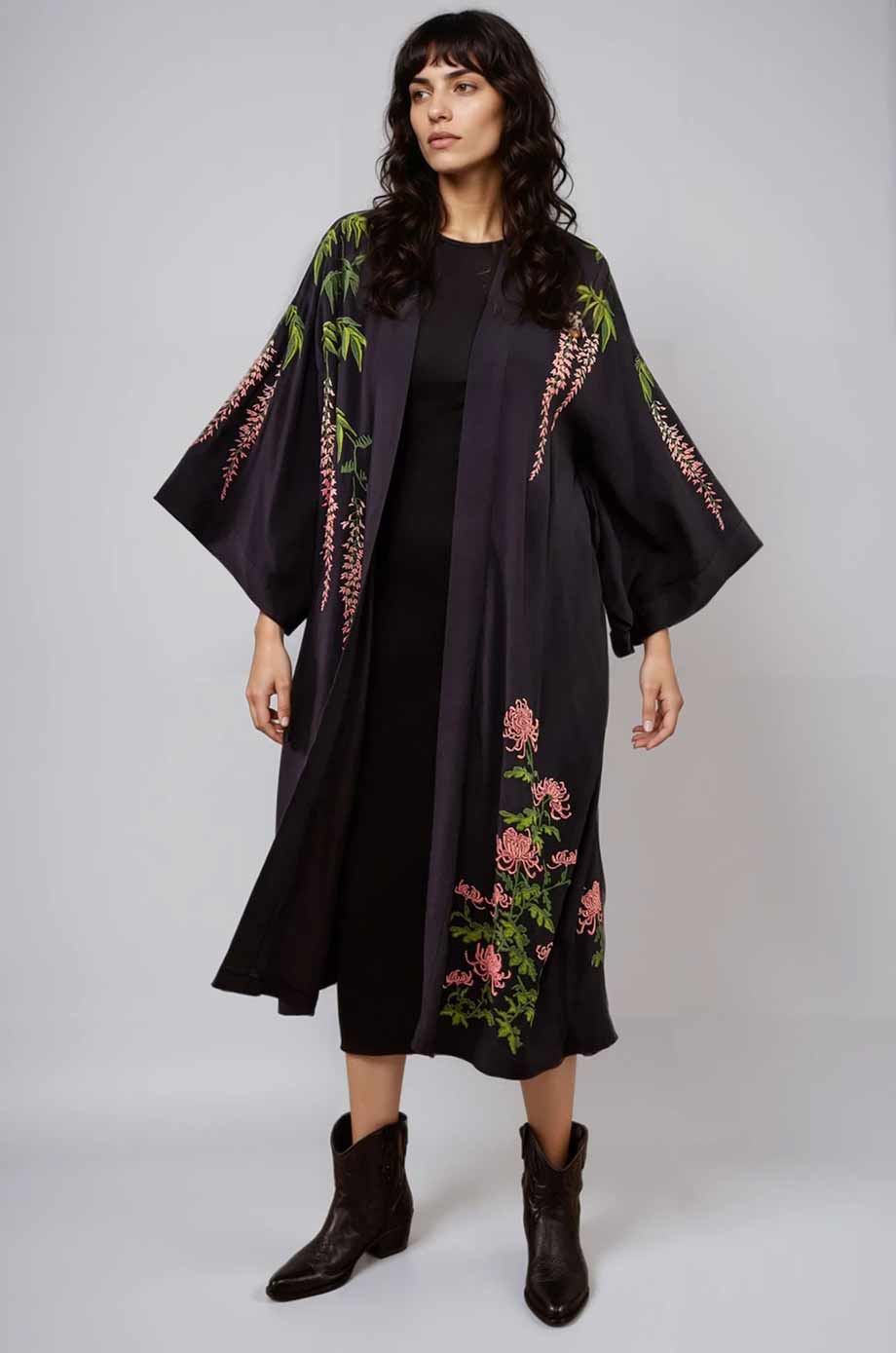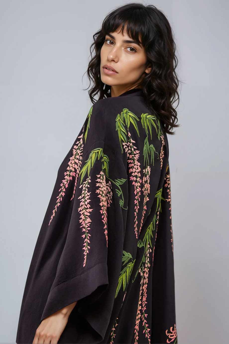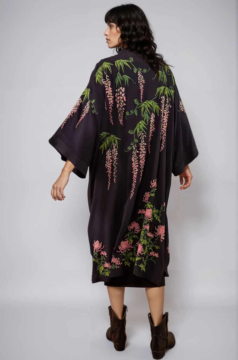 ARTEMIS MUSE EMBROIDERED LONG KIMONO VINTAGE WISTERA AND PEONY BLACK