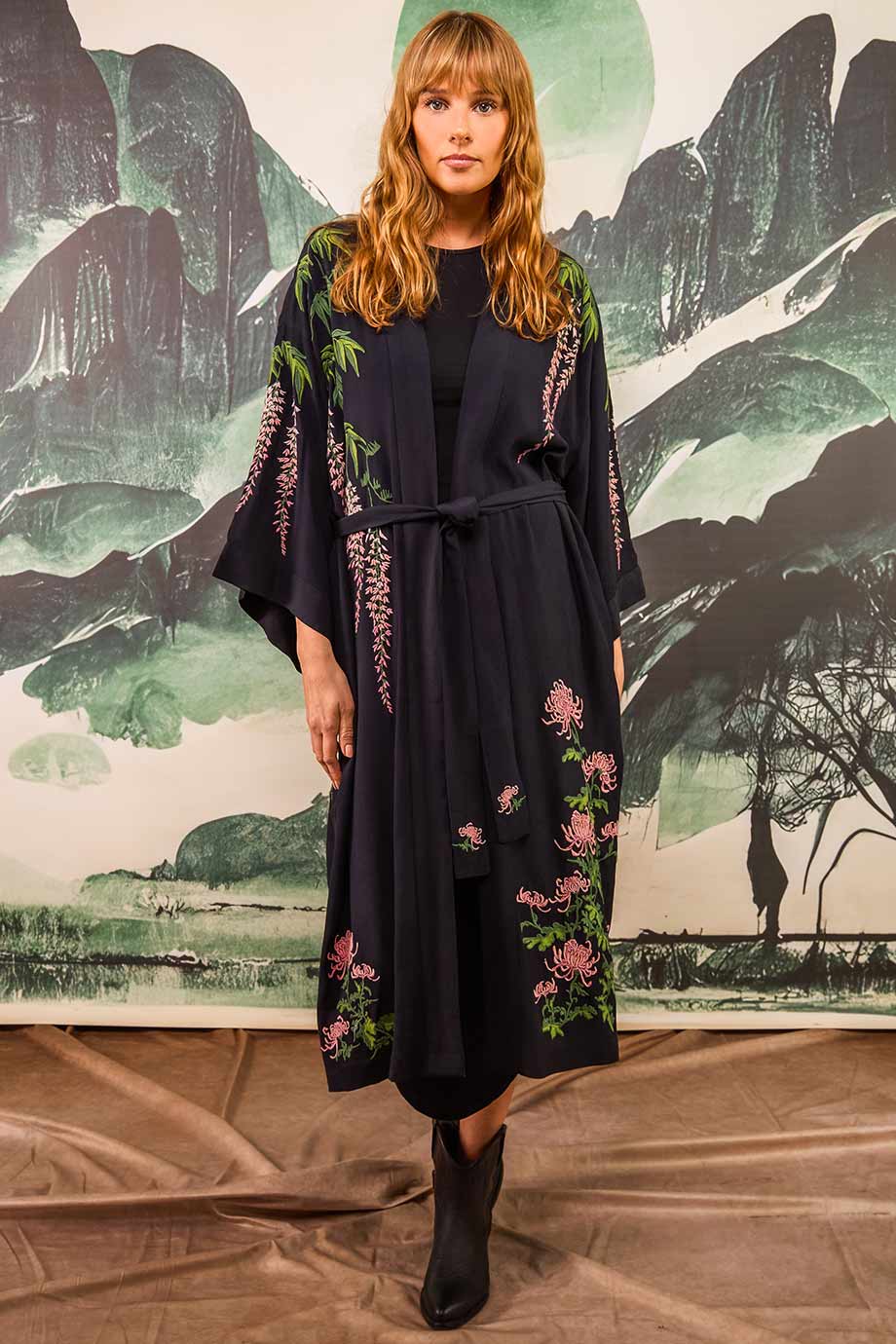 This stunning black fully lined long embroidered kimono is an elegant piece. Inspired by Japanese kimonos it features wisteria and chrysanthemums in a blend of contrasting and detailed pink & green embroidery.