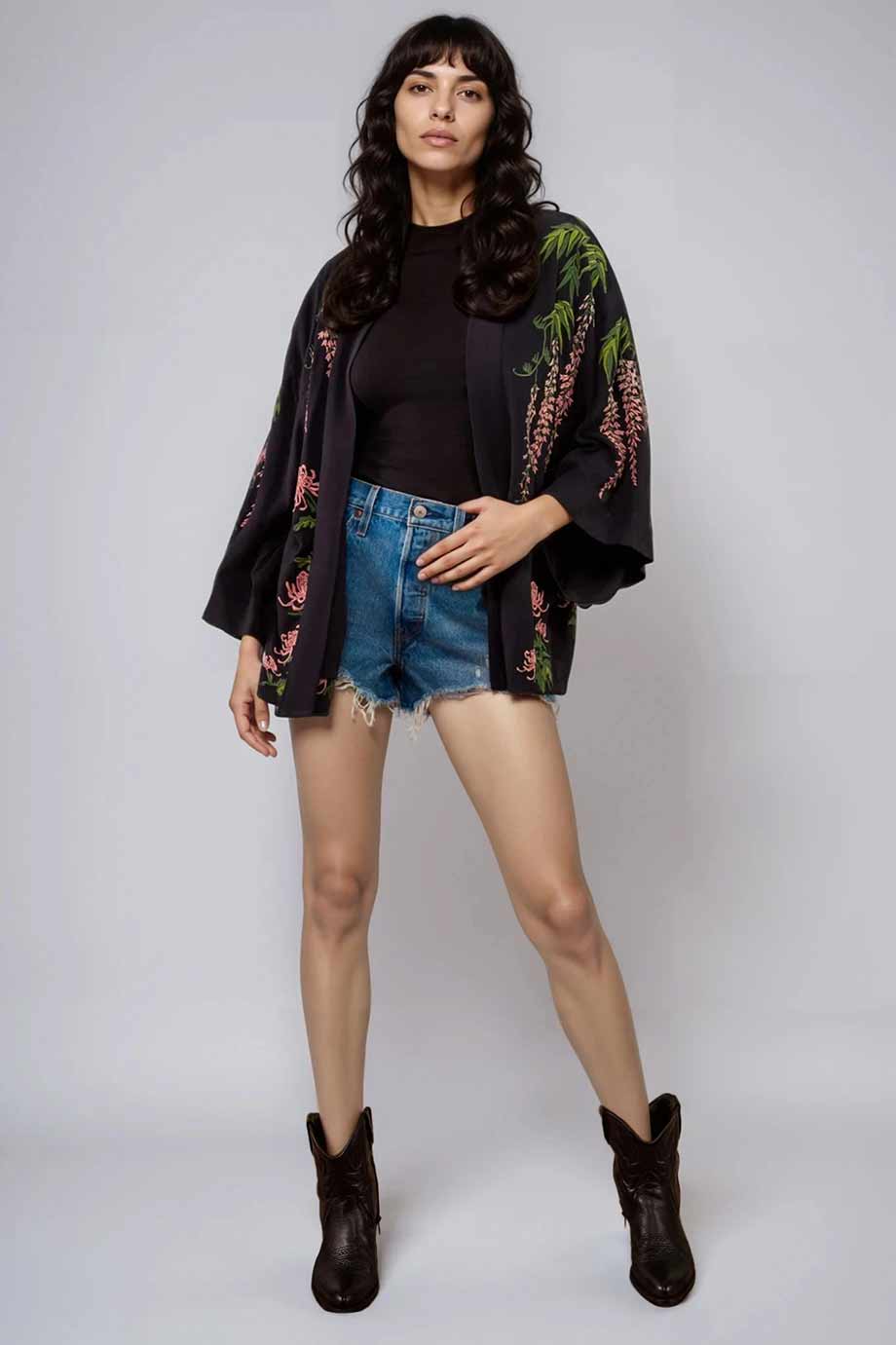 This stunning black and pink fully lined short embroidered kimono is a statement piece. Inspired by Japanese kimonos it features wisteria and peony in a blend of contrasting and detailed pink & green embroidery.