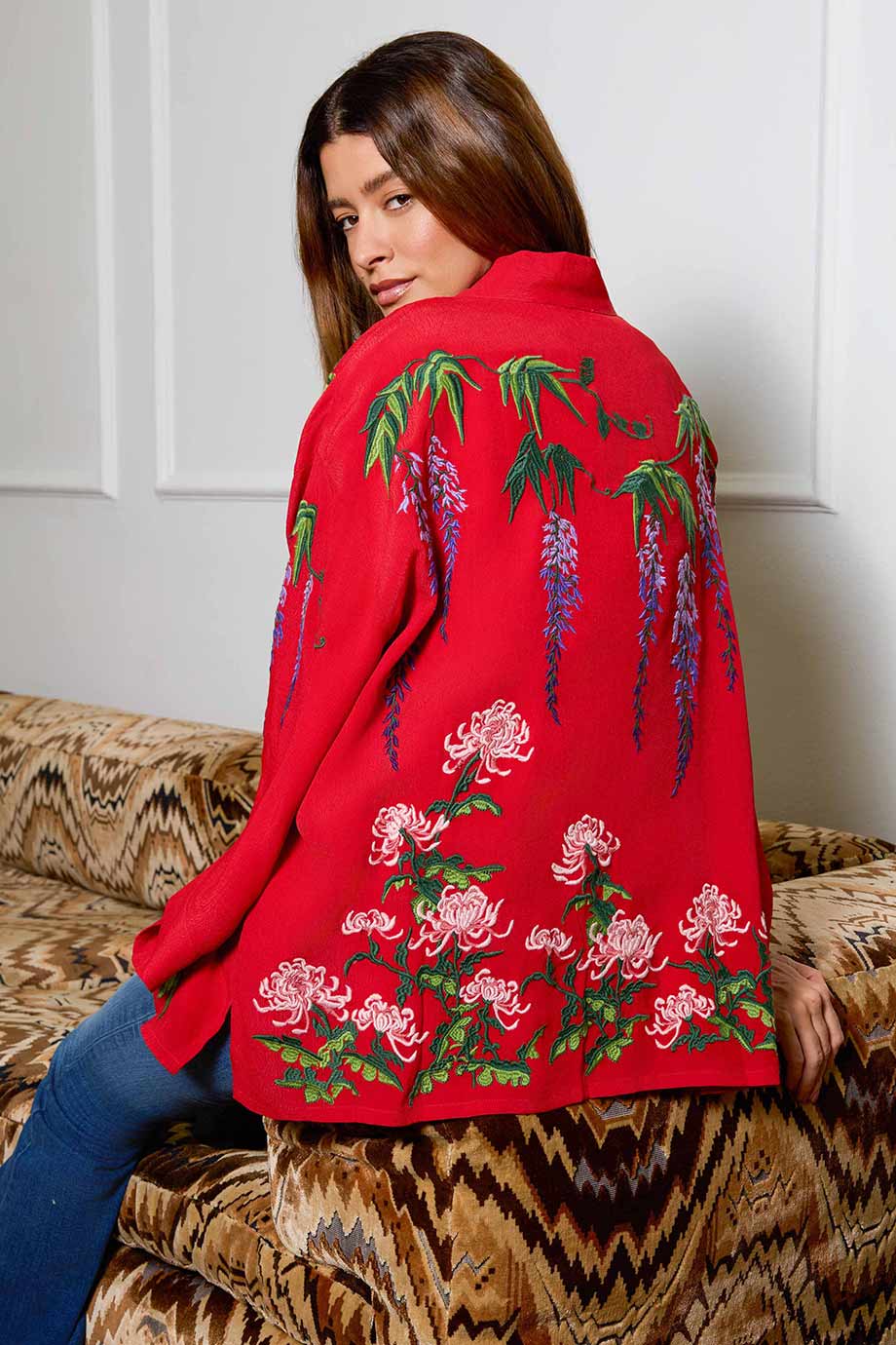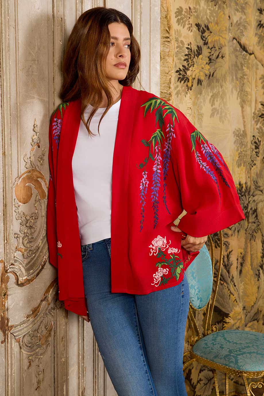 This stunning red coloured fully lined short embroidered kimono is a statement piece. Inspired by Japanese kimonos it features wisteria and peony in a blend of contrasting and detailed coloured embroidery.