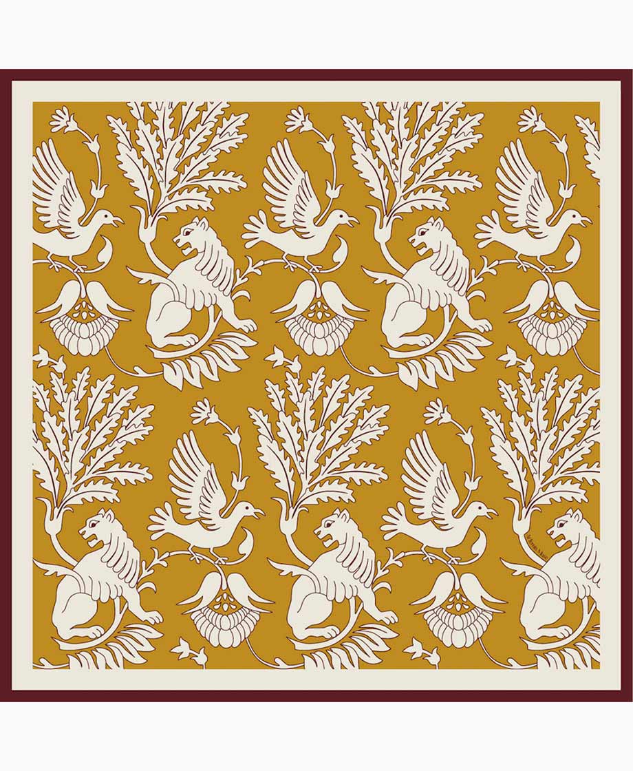 ARTEMIS MUSE SILK SCARF REGAL DOVES + LIONS MUSTARD
