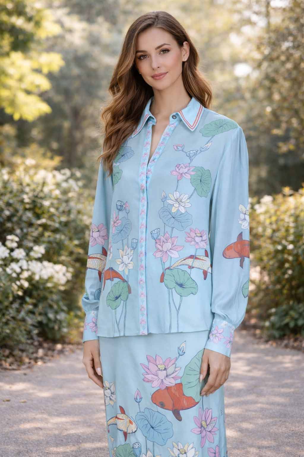 The RONITA SHIRT carries a soft, relaxed silhouette that sits lightly on the body while keeping a clean, polished shape. The engineered print features lotus florals and koi motifs flowing across a calm blue base, creating an artistic statement that instantly attracts attention. The structured collar, button front, and gathered sleeves add refined detailing without feeling stiff. 100% viscose fabric feels smooth and breathable, draping naturally on the body and allowing fluid movement. It styles beautifully for brunch, travel, daytime outings, or elevated casual wear.