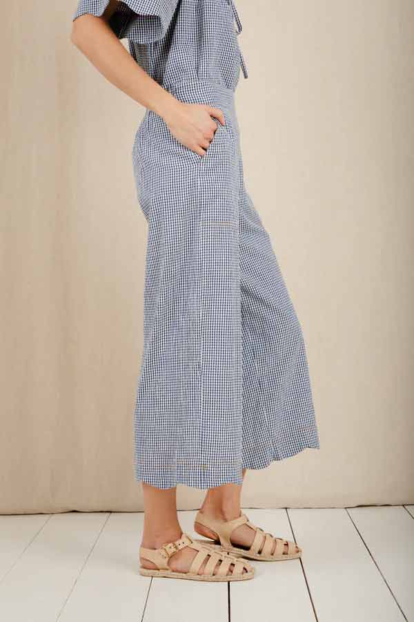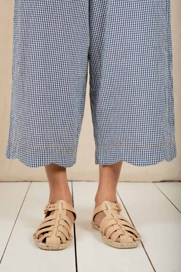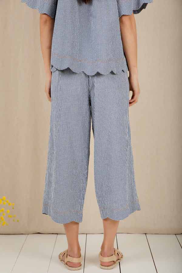 Loose + relaxed fitting, 3/4 length, wide leg, pull on organic cotton denim trouser in a mid wash, with an elasticated back and a feminine scallop hem detail.