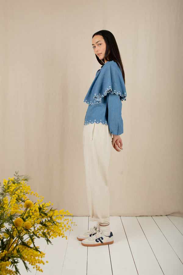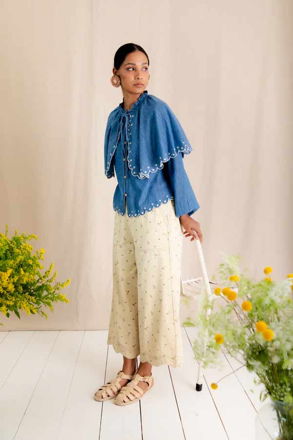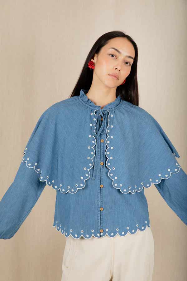 The cape collar detail + hem features a contrast scallop embroidery edge detail.