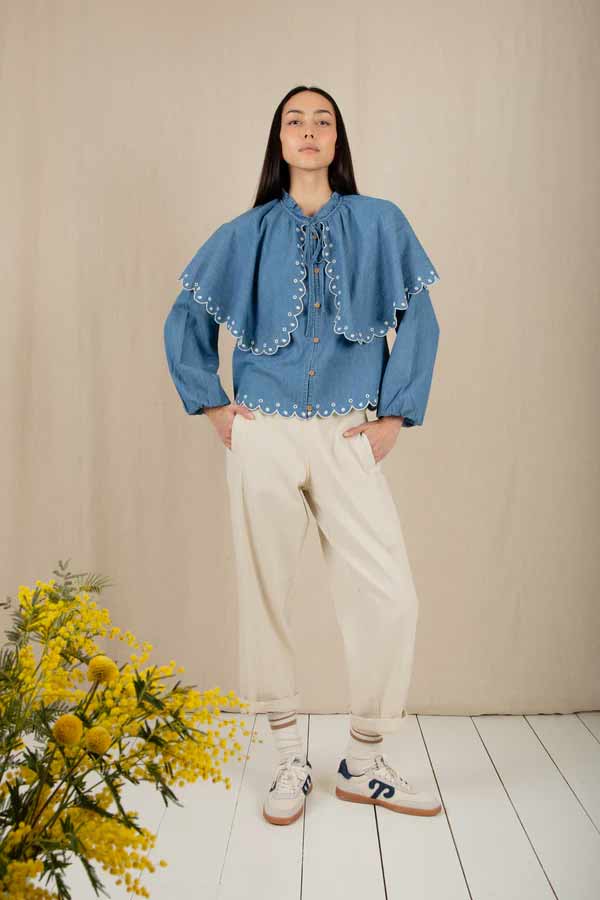 A button through denim shirt with a very romantic + feminine twist in organic cotton denim, in a mid wash.