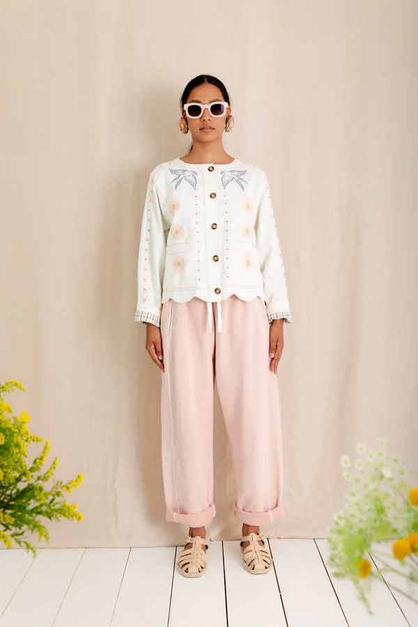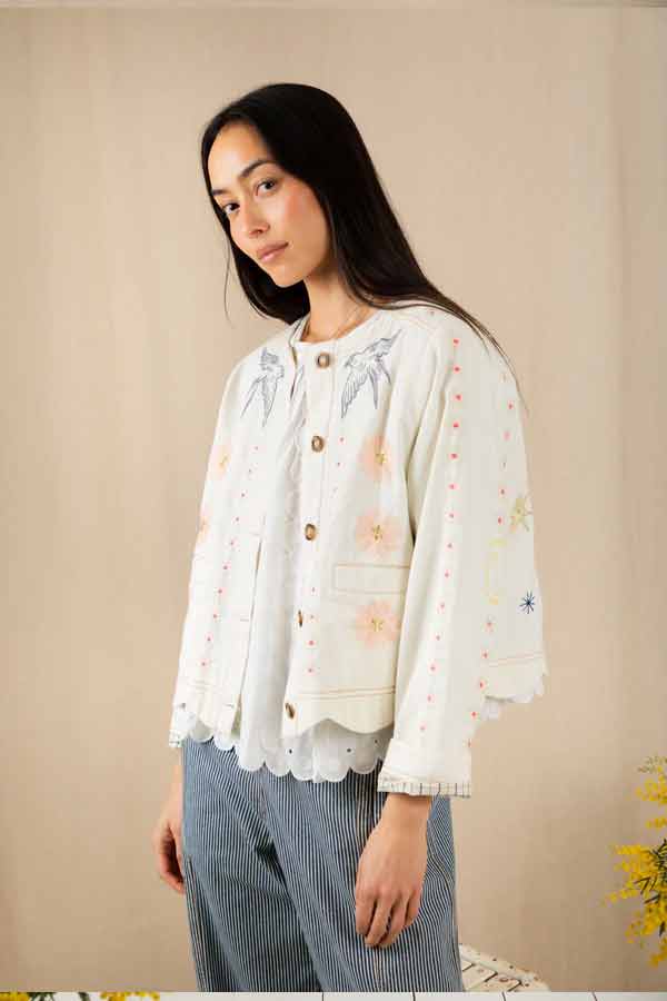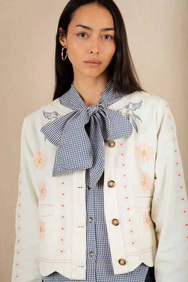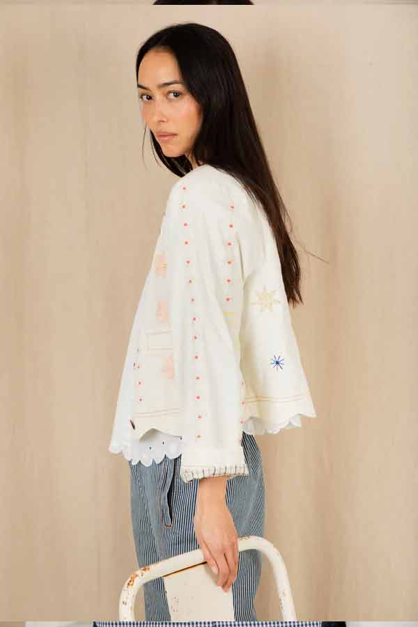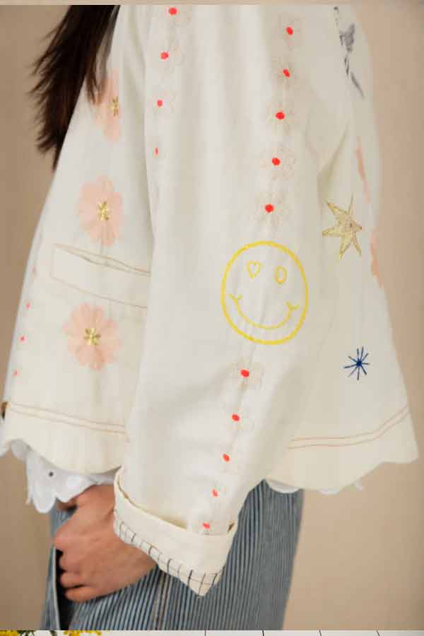 This is a beautiful + unique jacket, with a detailed placement embroidery, cut in a modern, boxy + relaxed shape, made in soft cotton twill, with contrast tan twin-needle detail.