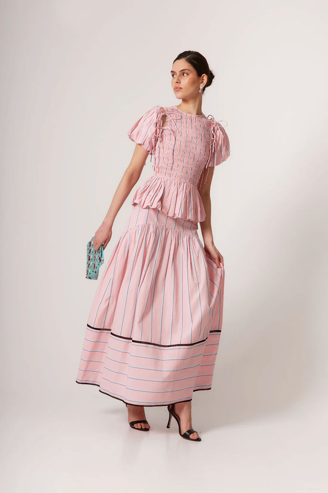 Two-piece set made from pink cotton with fine vertical stripes in navy and white. The top features a smocked bodice that comfortably hugs the silhouette, puffed sleeves with adjustable ties, and a ruffled hem that adds volume and movement. The matching high-waisted long skirt has a fluid drape and contrasting stitching at the hem. A fresh, romantic, and feminine design, ideal for a daytime look with personality.