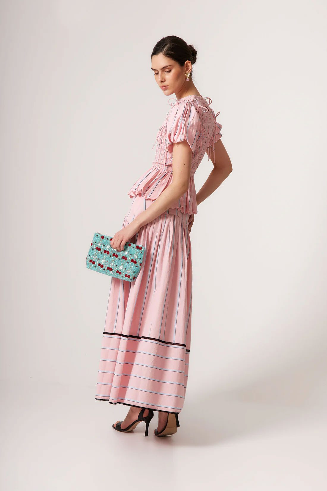 This top features a smocked bodice that comfortably hugs the silhouette, puffed sleeves with adjustable ties, and a ruffled hem that adds volume and movement.