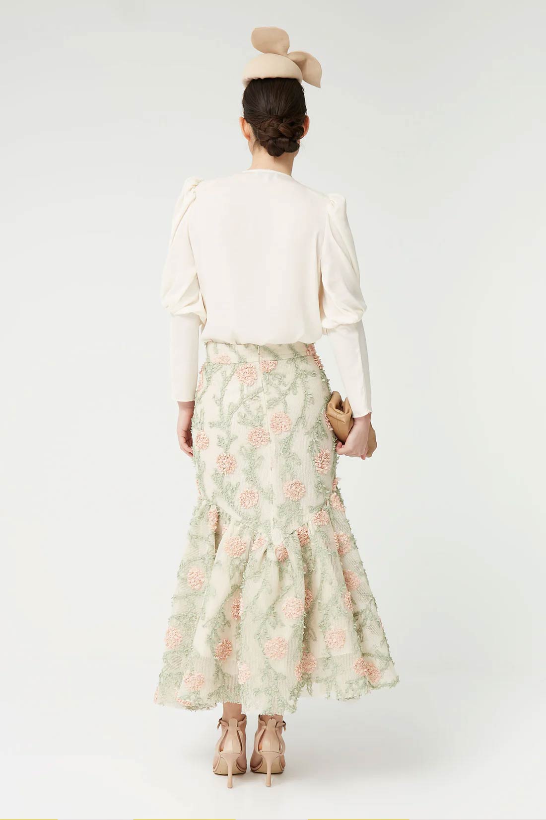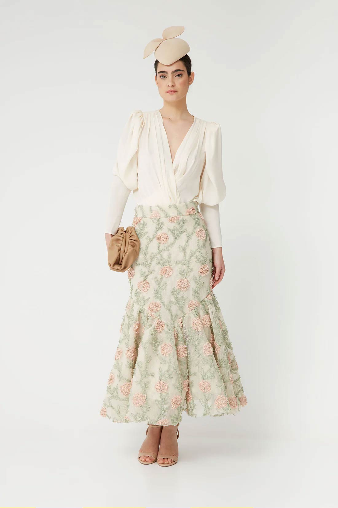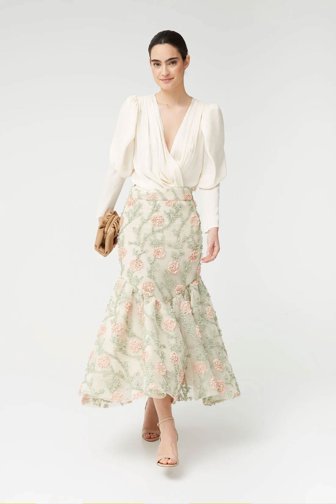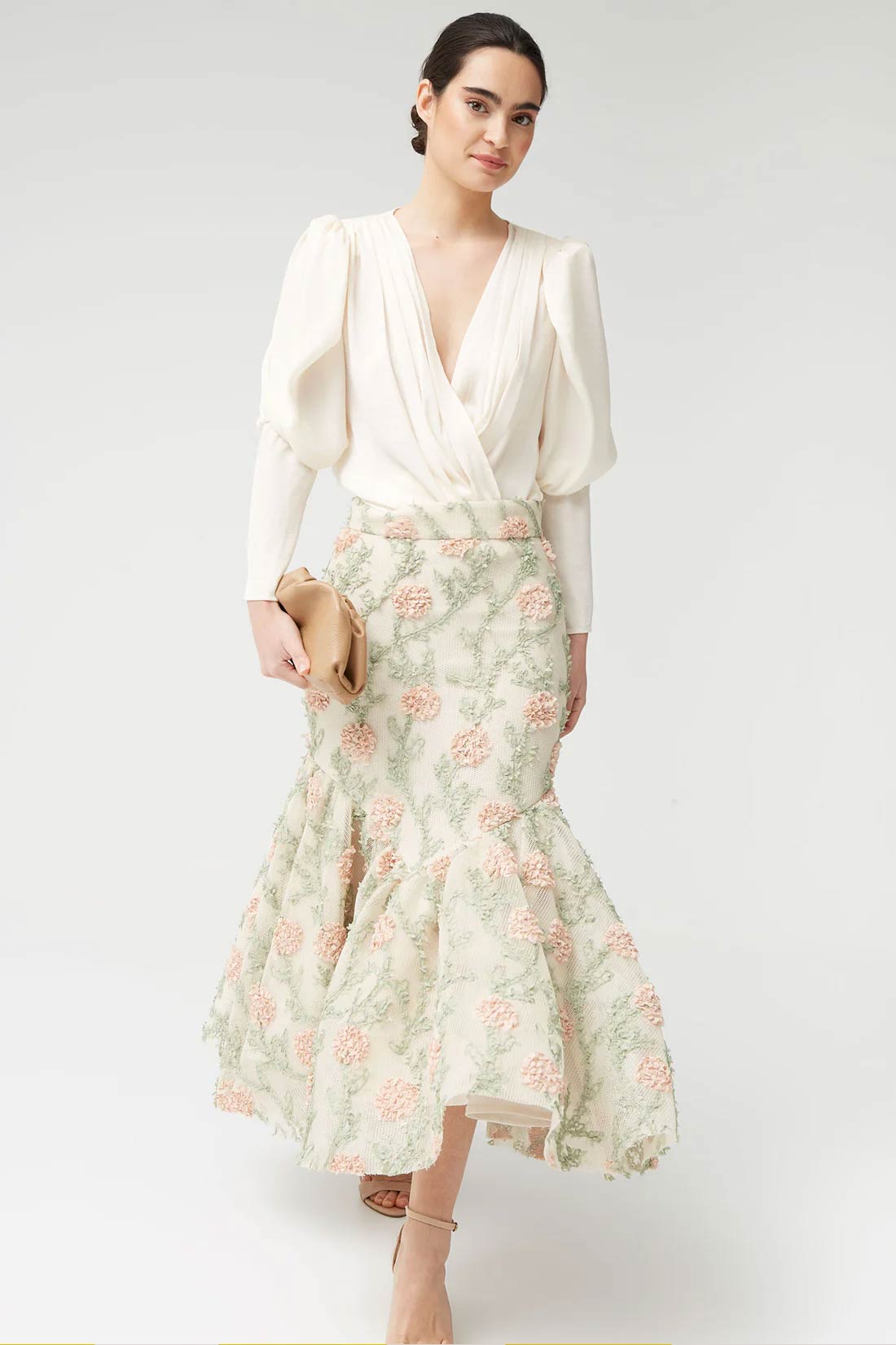 The Odise Skirt is a romantic and sophisticated garment that adds movement and delicacy to any look. Made from a lightweight fabric with floral embroidery, it stands out for its meticulous design and fluid drape, perfect for feminine and special outfits.
