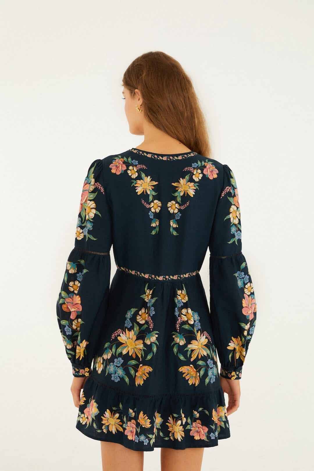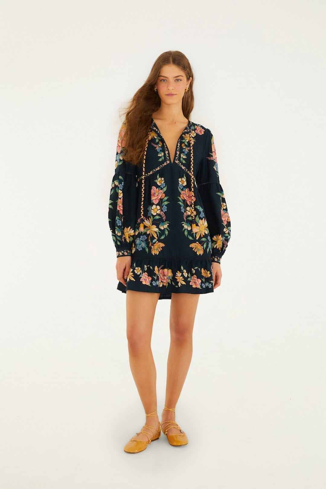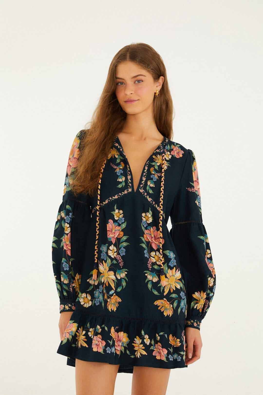 Embrace effortless charm with the Dark Blue Maira Floral Mini Dress by FARM Rio. Crafted from eco-friendly Euroflax and Lenzing fibers, this dress features a playful floral pattern that dances across a deep blue canvas. The round neckline and relaxed silhouette flow gently, while subtle details bring softness and joy to every move. Perfect for those who cherish vibrant nature-inspired style with a conscious heart.