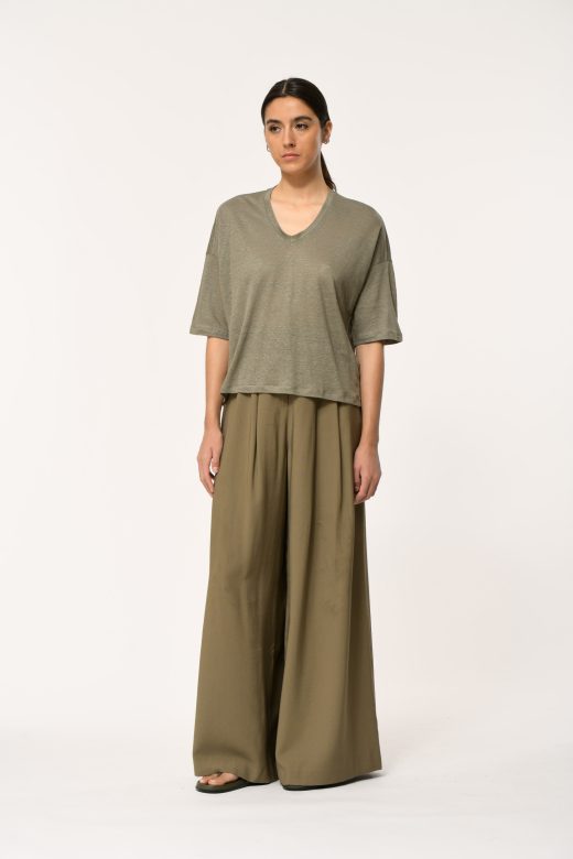 Loose-fitting tee-shirt in flamed linen, V-neck, elbow-length sleeves, dropped armholes.