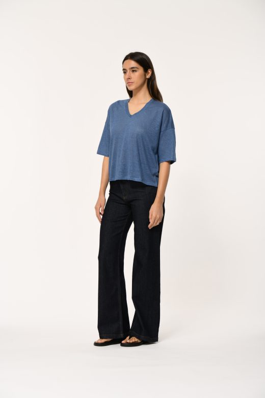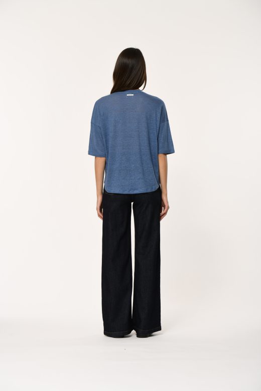 Loose-fitting tee-shirt in flamed linen, V-neck, elbow-length sleeves, dropped armholes.