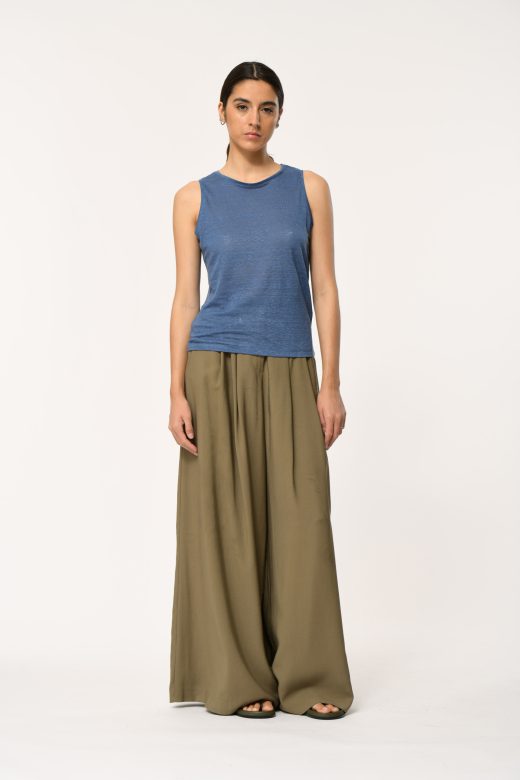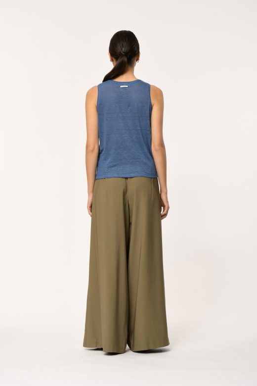 Loose tank top in slub linen, round neckline, straight cut.