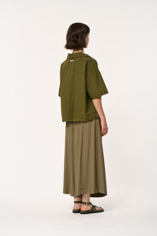 Loose top in crinkled cotton, polo collar, wide elbow-length sleeves, dropped armholes.