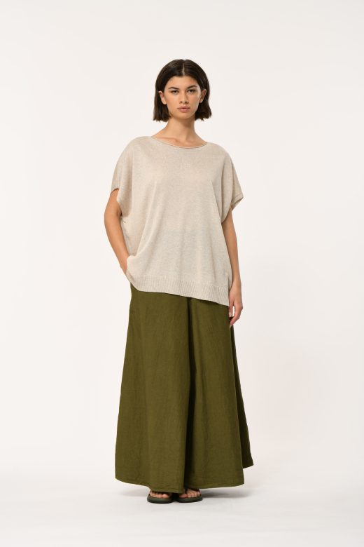 Oversized sweater in fine fluid knit, loose straight cut, boat neckline, integrated short sleeves, ribbed finish at hem.