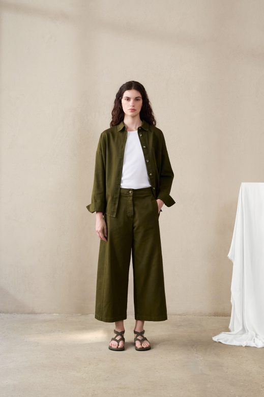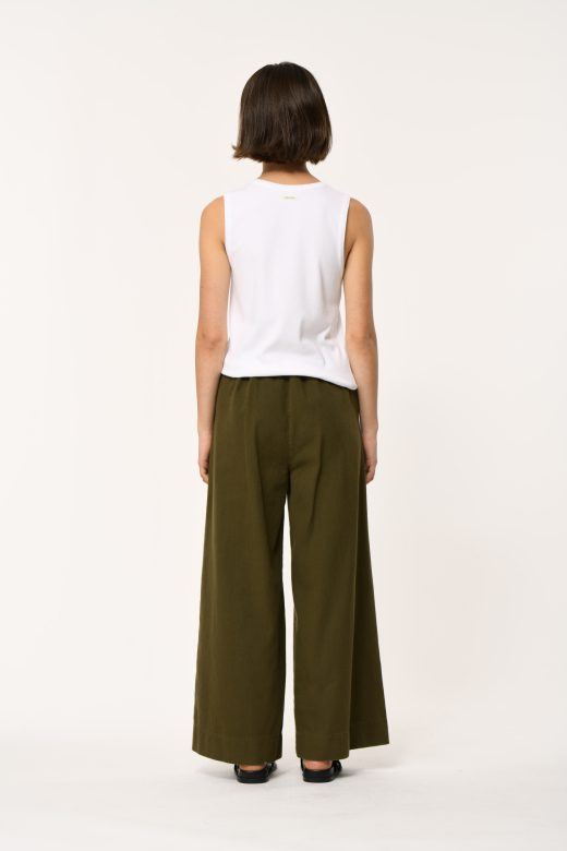 Barrel pants in cotton drill, 7/8 length, side panel on the leg, high waist, waistband with belt loops, closed with button and fly, invisible front side seam pockets.