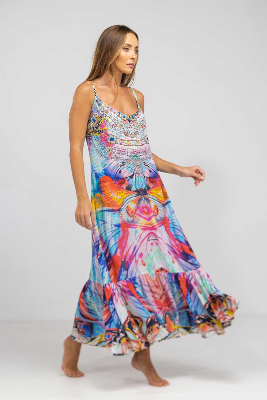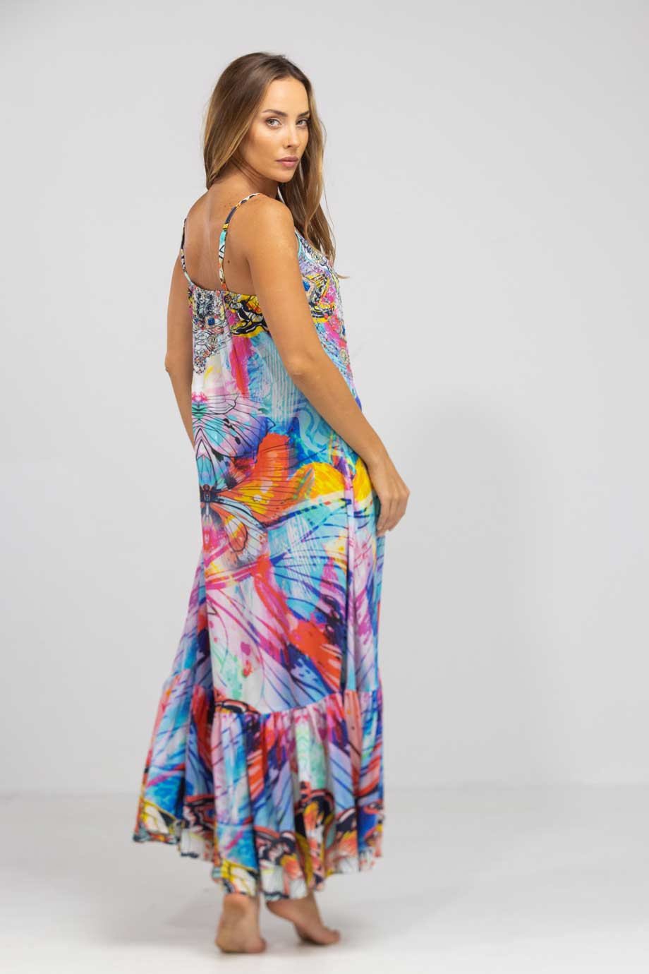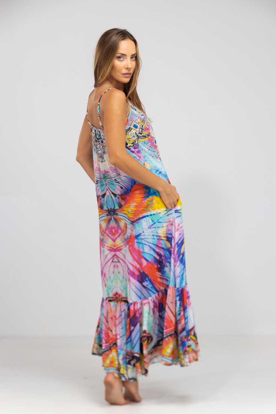 Canberra frill strap maxi-dress with crystals and V-neck.