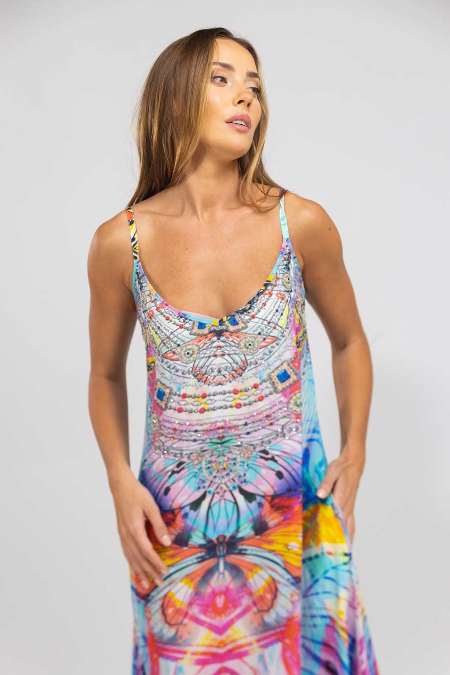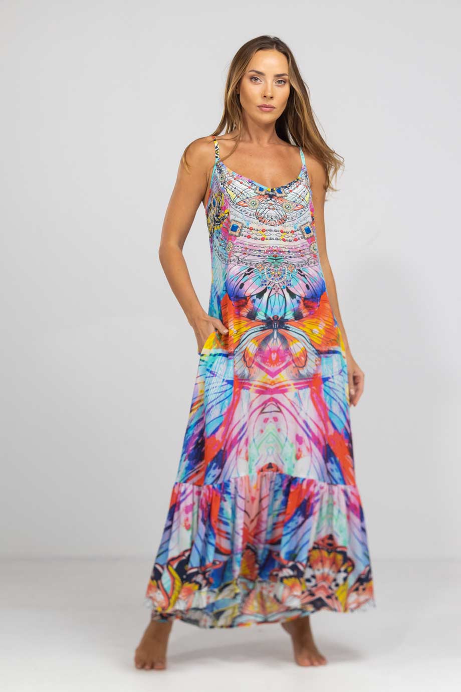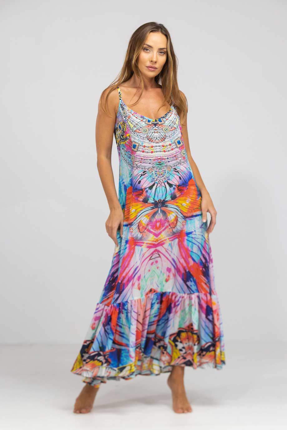 Canberra frill strap maxi-dress with crystals and V-neck.