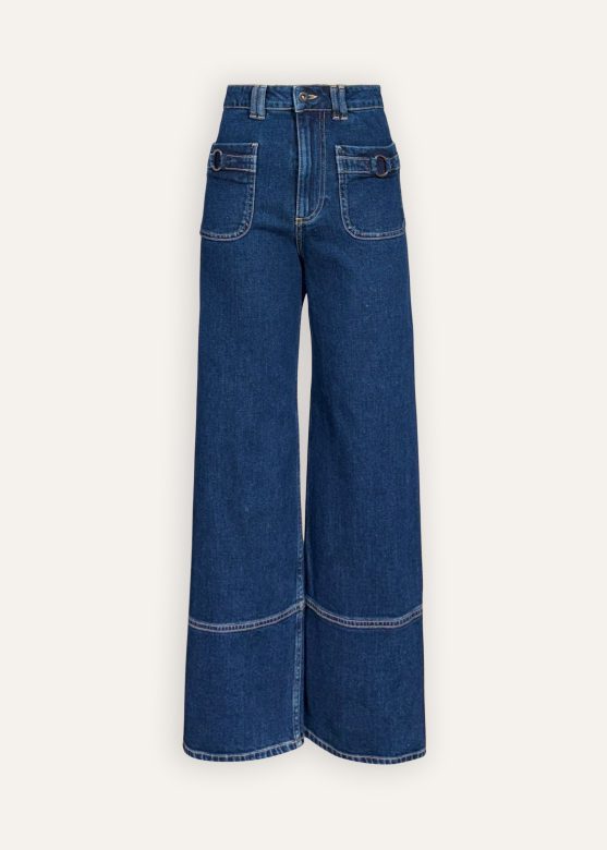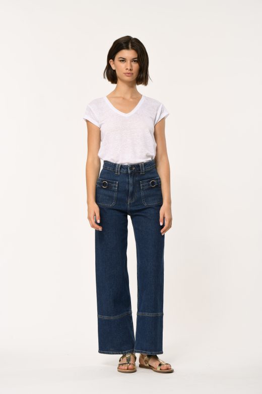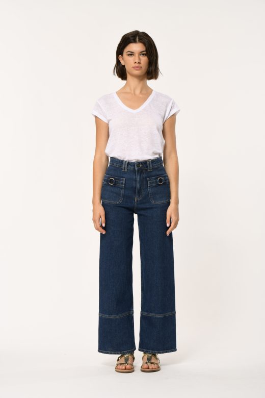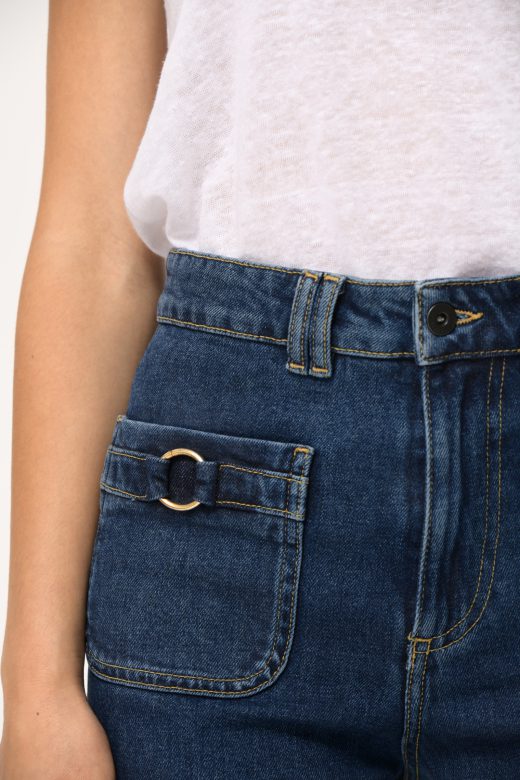 Straight leg jeans, 7/8 length, high waist, patch pockets front and back, metal button and zip fly, wide hem. Metal buckle detail on front pockets.