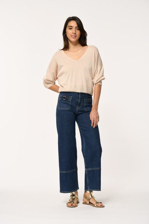 Fine knit shiny sweater with deep V-neck and 3/4 puff sleeves.