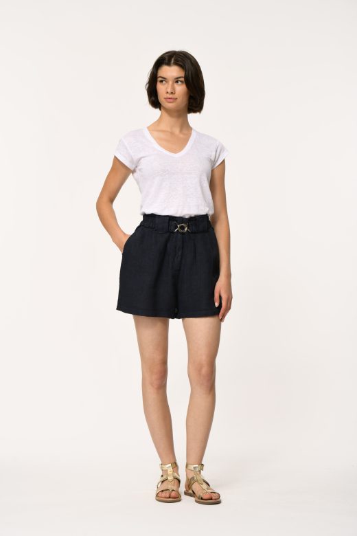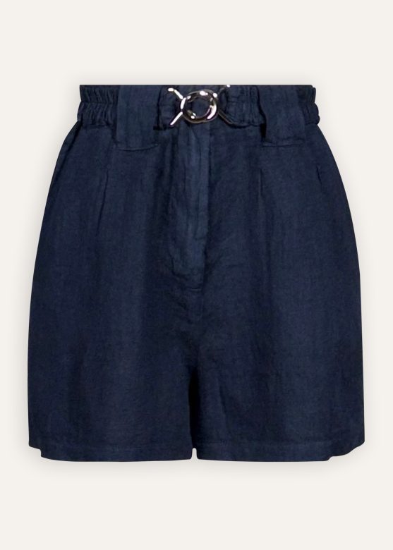 Linen shorts, wide leg, high waist, removable elasticated waistband with decorative hook.