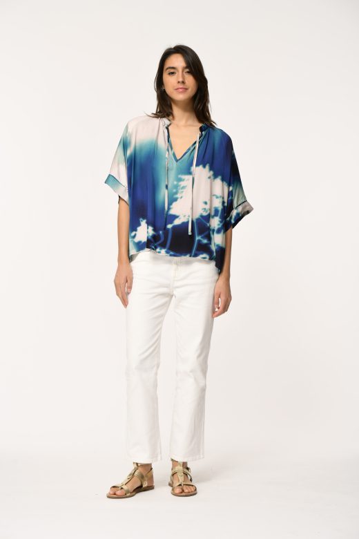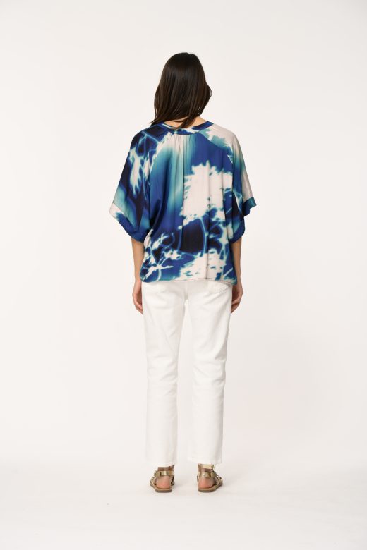 Loose printed blouse, Tunisian collar, elbow-length sleeves.