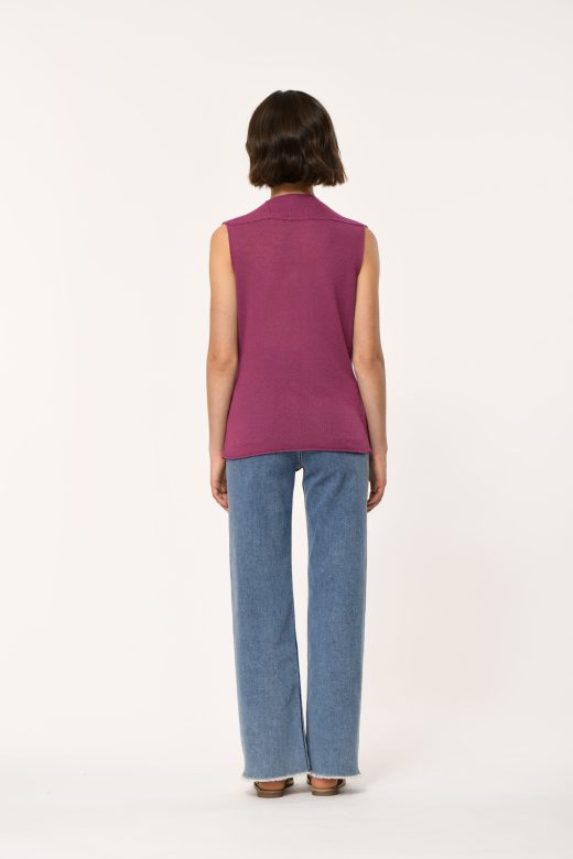 Fluid knit sweater with bell neckline without sleeves.