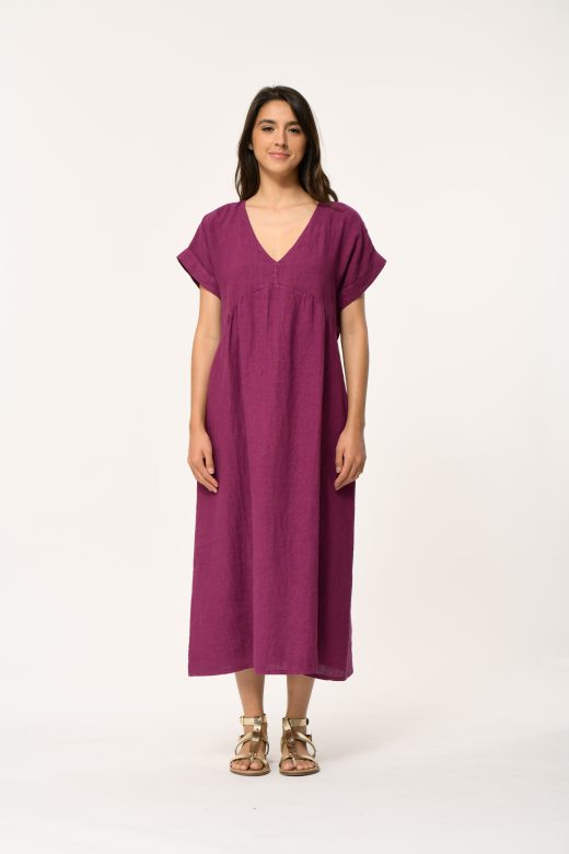 Long linen dress, loose fit, v-neck, short sleeves with embroidery details at the neckline.