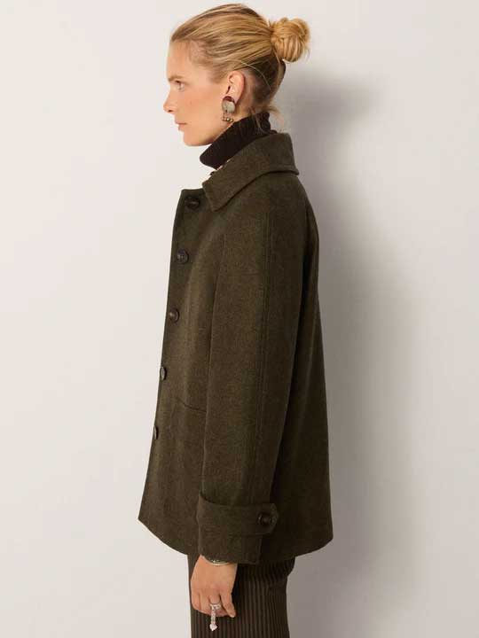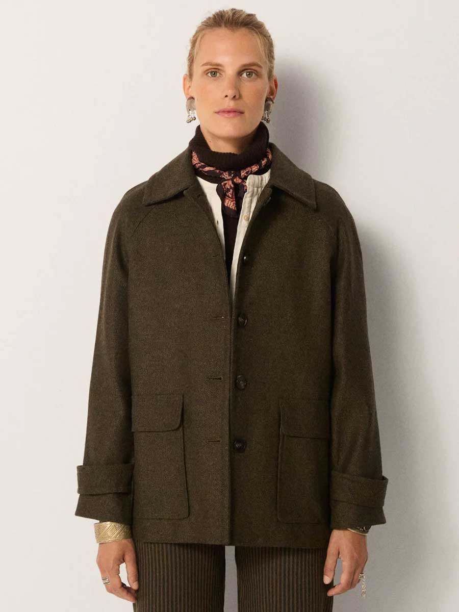 Meet Henri. Boxy, cropped and crafted in a dense wool blend, designed to feel both utilitarian and refined. Its straight cut and sharp collar make it versatile, while the deep olive tone grounds the look with earthy sophistication.