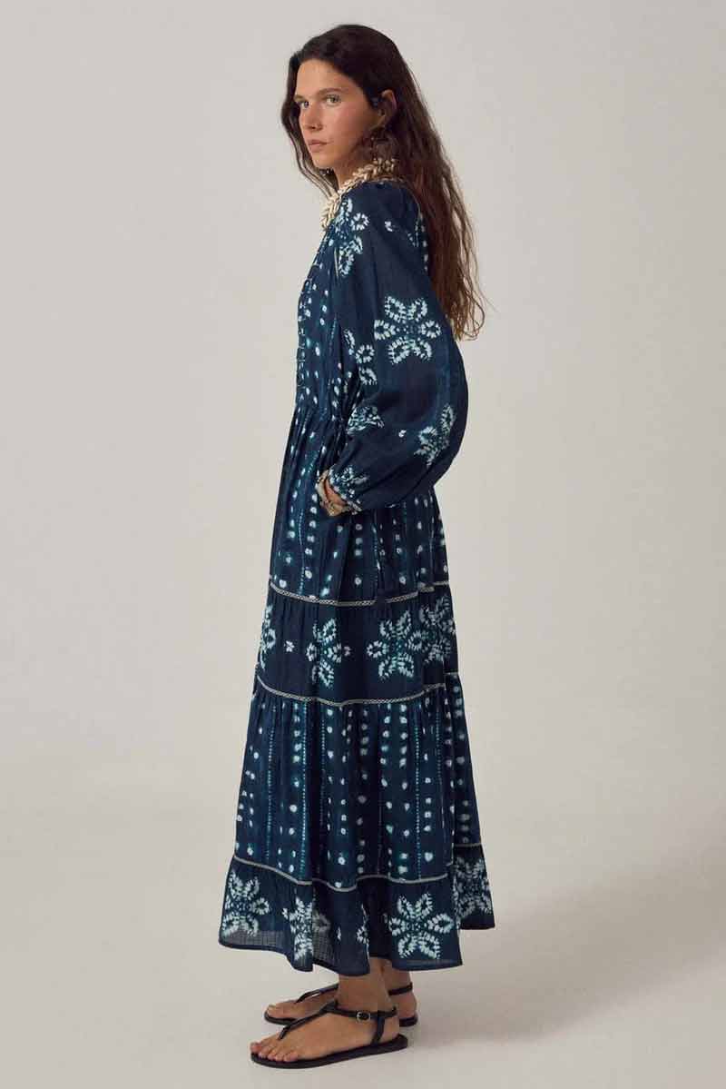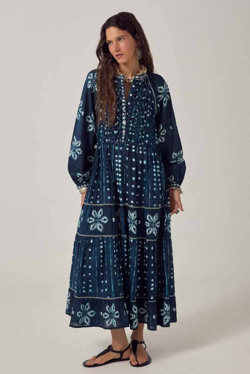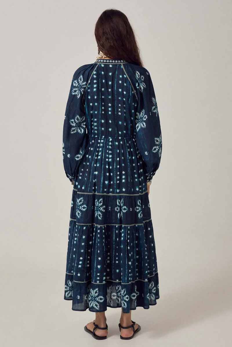 Shibori-inspired print in midnight navy and sky blue, inspired by traditional Japanese dyeing. Cut in 100% cotton with smocking across the chest and long sleeves with embroidered cuff details. Buttons down the front to the waist, round neckline with embroidered trim. Lined to the knee so it moves easy but keeps its shape.
