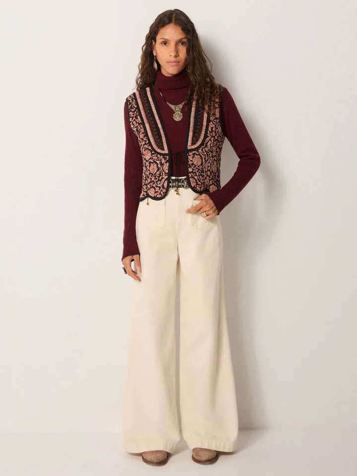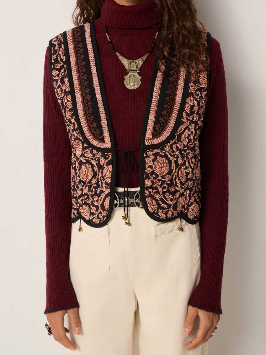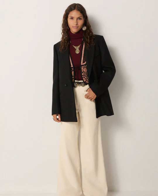 Details include a neat open front, edges finished with fine embroidery, and a tailored cut that keeps the silhouette sharp while letting the embroidery take center stage.