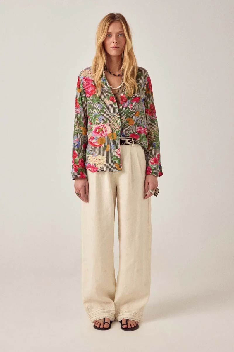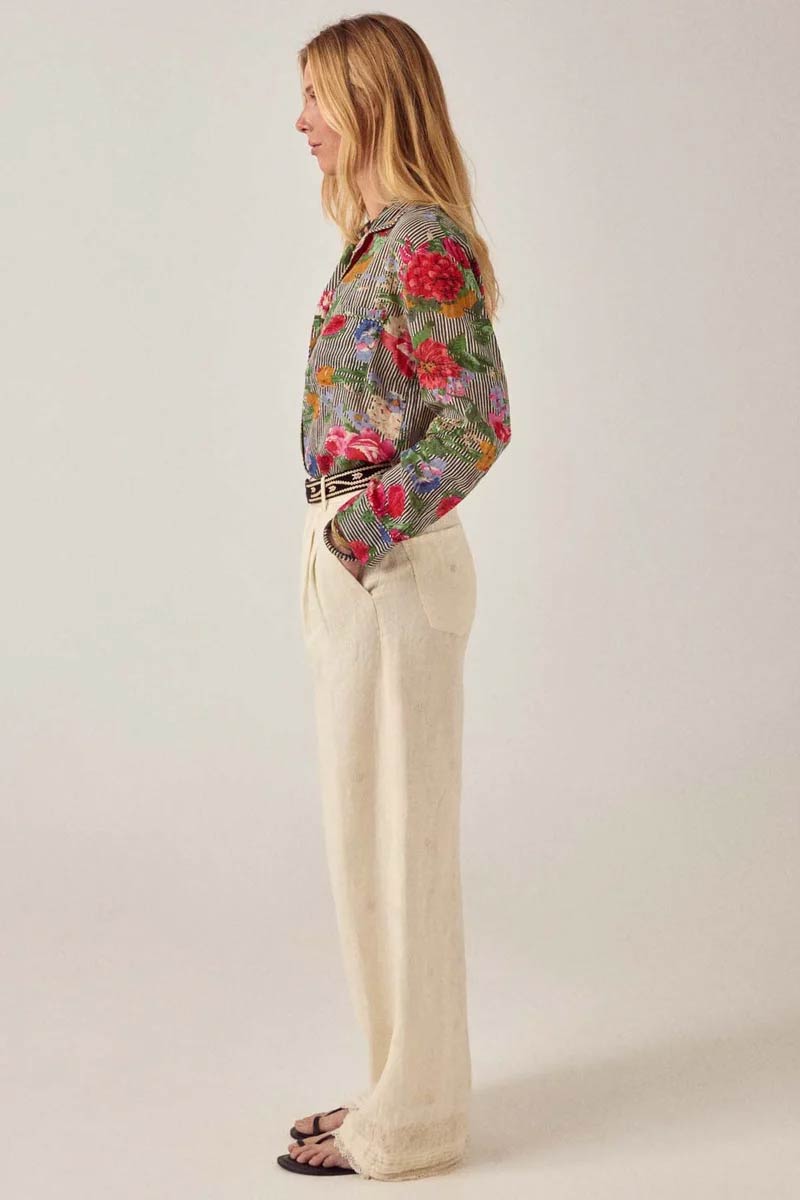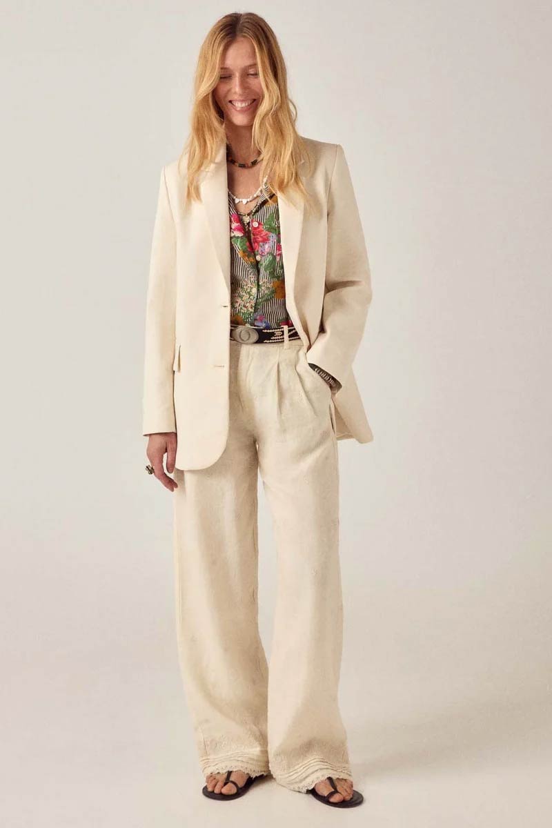 Straight-leg pant in cotton-linen mix. Sits softly at the waist with subtle pleats at the front. Straight fall through the leg. Button and zip closure, side pockets and back pockets. Embroidered detailing along the hem and pockets.