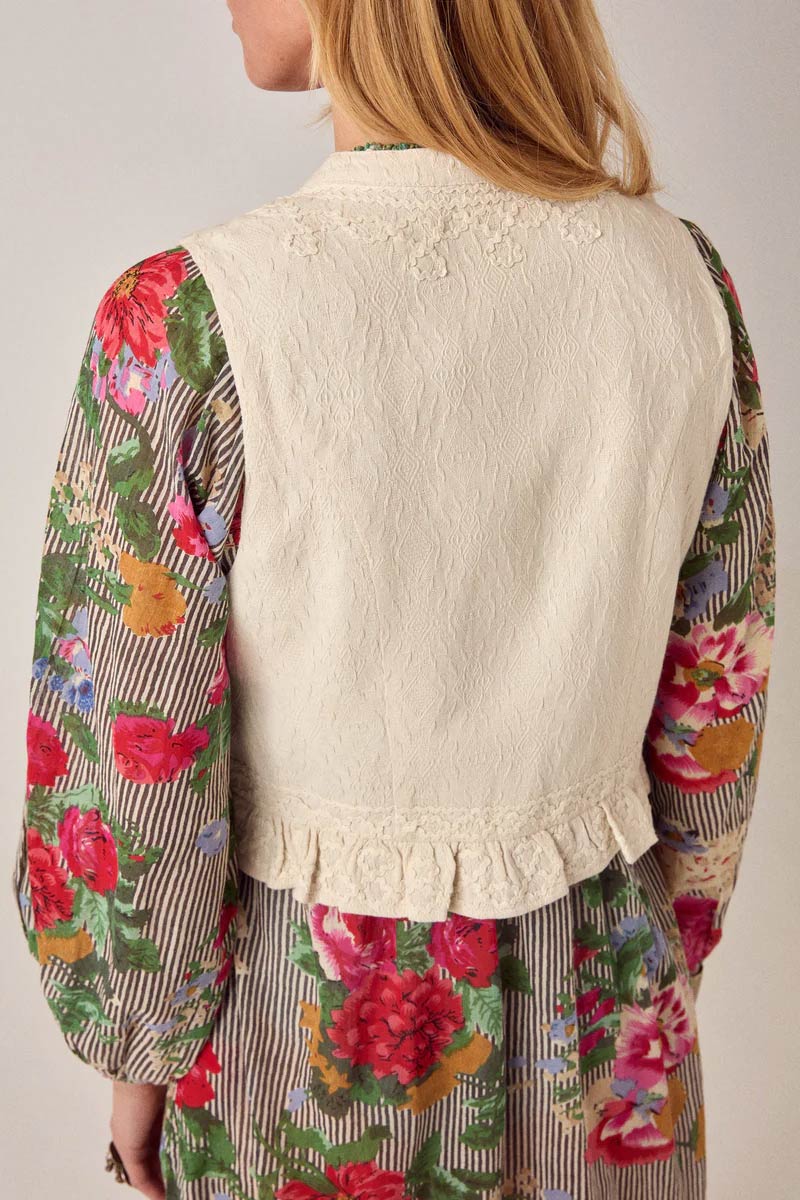Cropped vest in off-white cotton handloom jacquard with raised floral pattern. Round neckline, wooden buttons down the front, finished with a ruffle peplum at the hem. Sleeveless, hits just above the natural waist.