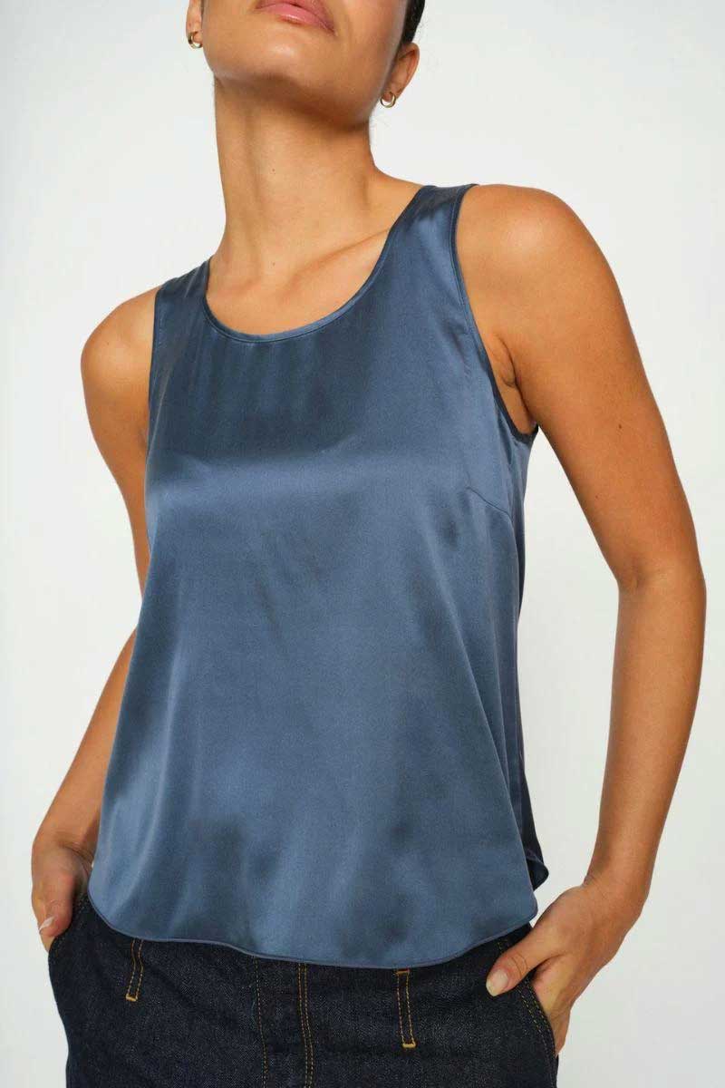 This silk top floats like water and feels so smooth. Made in a relaxed silhouette, finished with curved hem that is slightly longer in the back. The shape of this tank top has a sporty feel while the silk makes it so feminine at the same time. Wear it as a shiny element with classic tailoring.