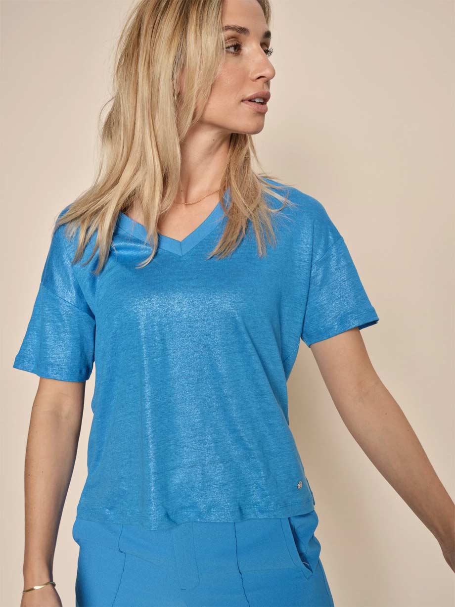 Add some extraness with this cool foil tee. It’s designed in a regular silhouette and crafted from linen. It’s finished with a v-neck and has rib details. We love the trendy foil effect and would wear this tee with jeans or tailoring, giving a cool take on a classic office look.