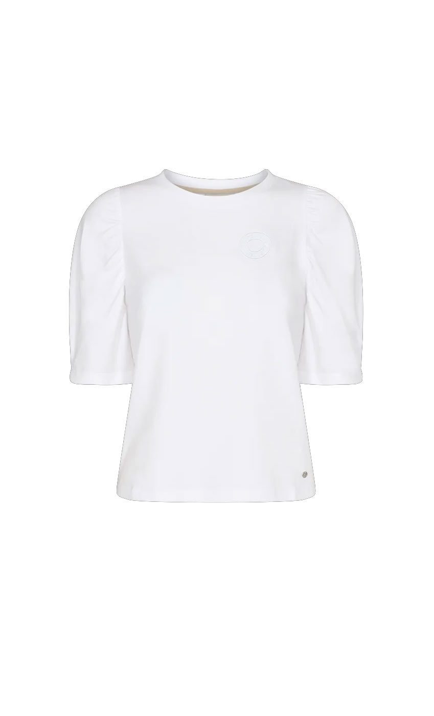 This tee is such a stunning item. It’s crafted from a cotton blend and designed in a slightly fitted silhouette with a pleated effect at the shoulders, giving billowy sleeves. It has tone-in-tone embroidery at the left chest, and we would style it with cool cargo pants and high heels for an evening out with your loved ones.
