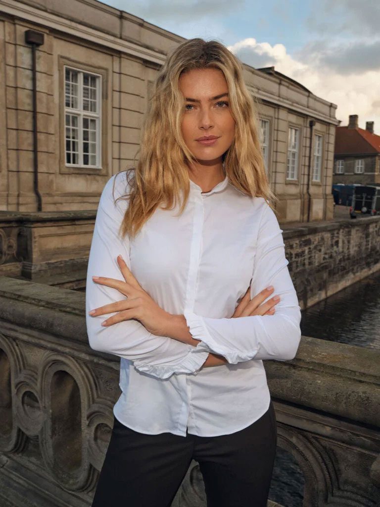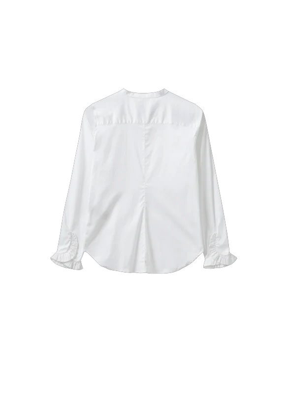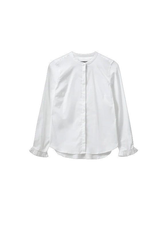 This refined shirt is crafted from a soft cotton blend with a hint of stretch for comfort. Designed with a chic band collar and delicate ruffled cuffs, it adds a feminine touch to a timeless silhouette. The concealed button closure creates a clean, sophisticated look – perfect for both office styling and elegant evenings out.