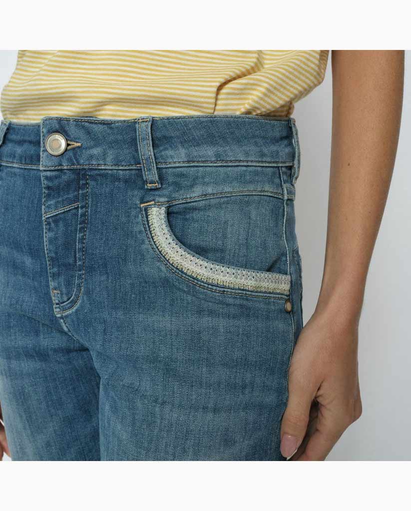 Mid Blue Naomi Salute Shorts from Mos Mosh.They have a regular fit and a mid-high waist.The shorts have side slit pockets with fine embroidery details along the front hem.