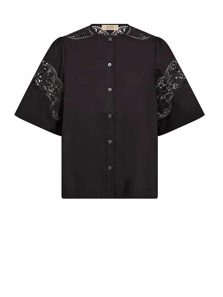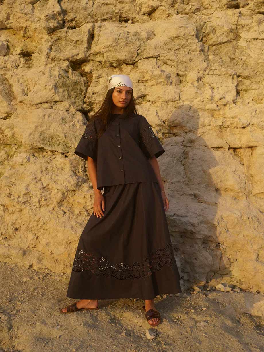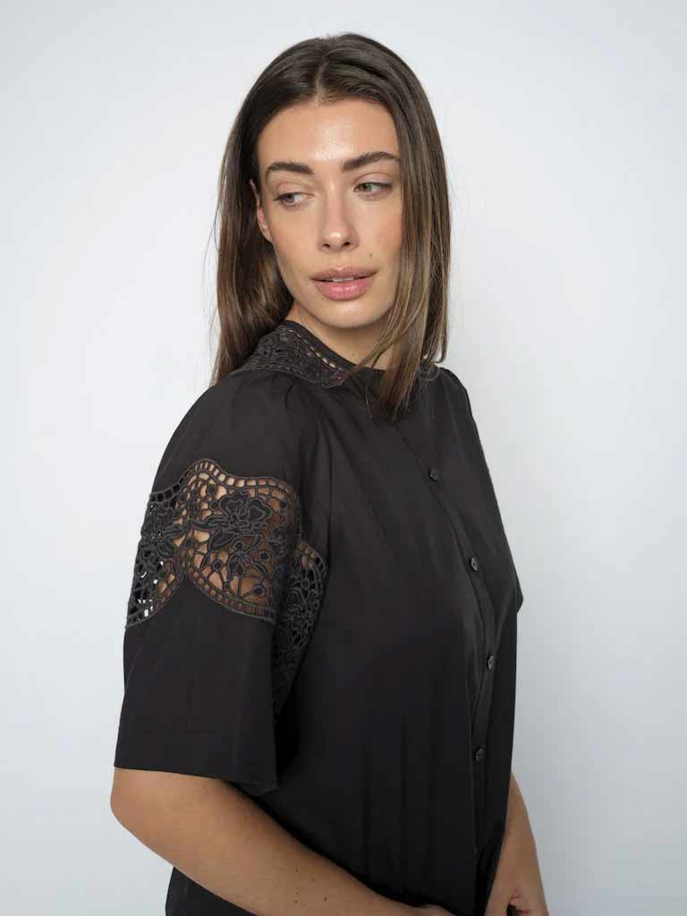 Effortlessly elegant, this black cotton shirt combines timeless style with refined details. The relaxed fit ensures all day comfort, while delicate broderie anglaise embroidery adorns the sleeve and neckline back for a touch of sophistication. Front button closure makes dressing simple, whether you’re layering for the office or wearing solo for weekend ease. A versatile wardrobe essential that transitions seamlessly from day to night.