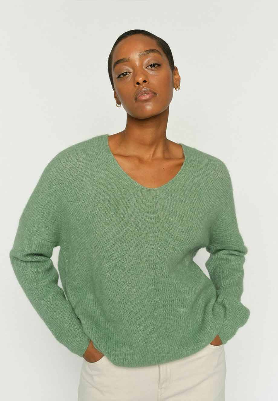 Spun from a soft blend of alpaca and responsible wool, this relaxed knit offers both warmth and effortless elegance. Designed with a flattering V-neckline and long sleeves, it drapes beautifully on the body. Wear it with jeans for a cozy everyday look or style with tailored pants for refined comfort.