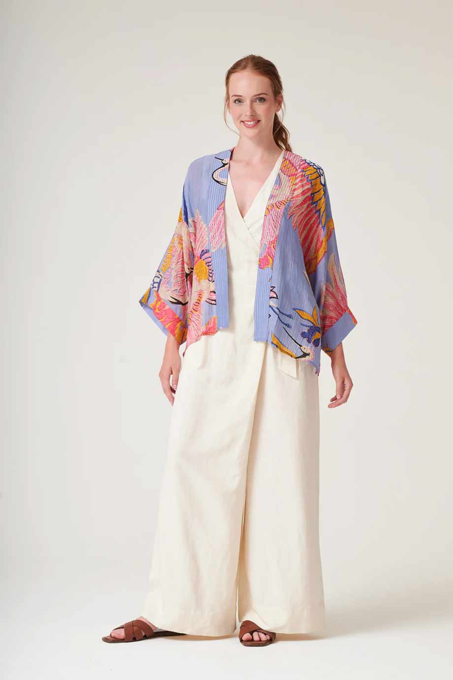 Our bestselling kimono jackets have loose ¾ length sleeves, an open front and a lightly embroidered lapel. Pair with a matching camisole and your favourite jeans in summer or layer over a polo neck during the cooler months.