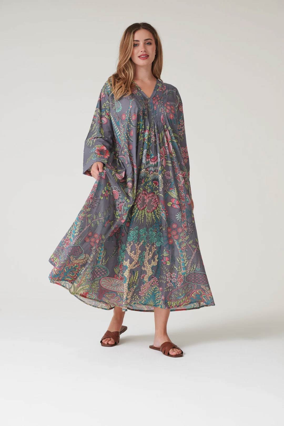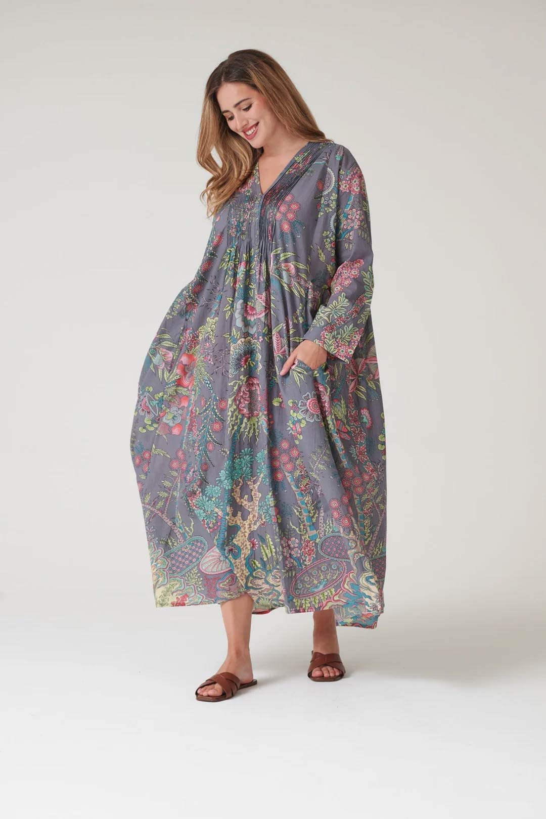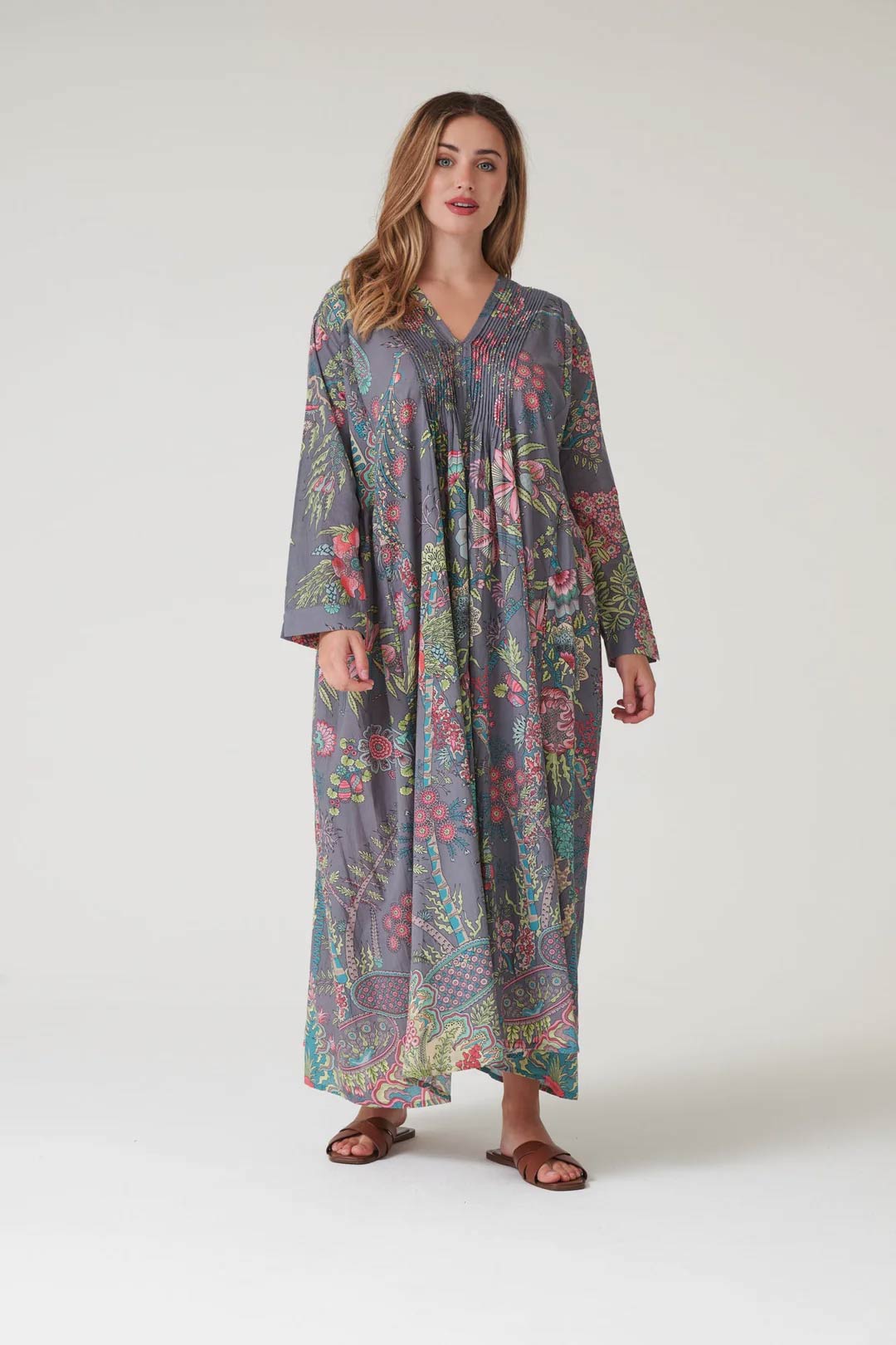 With its delicately pleated placket top leading down to a flowing maxi skirt, this dress showcases the entire One Hundred Stars signature print.