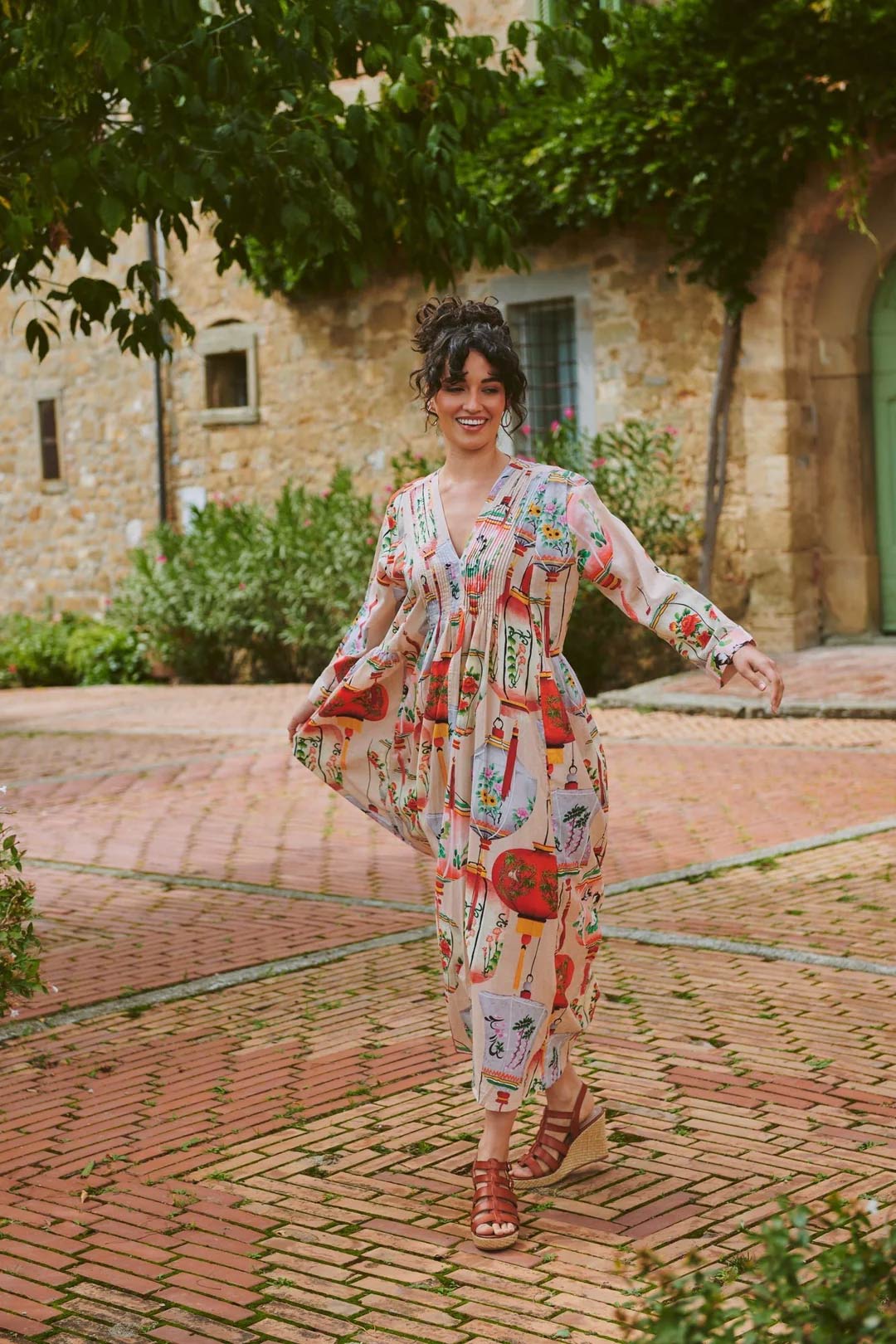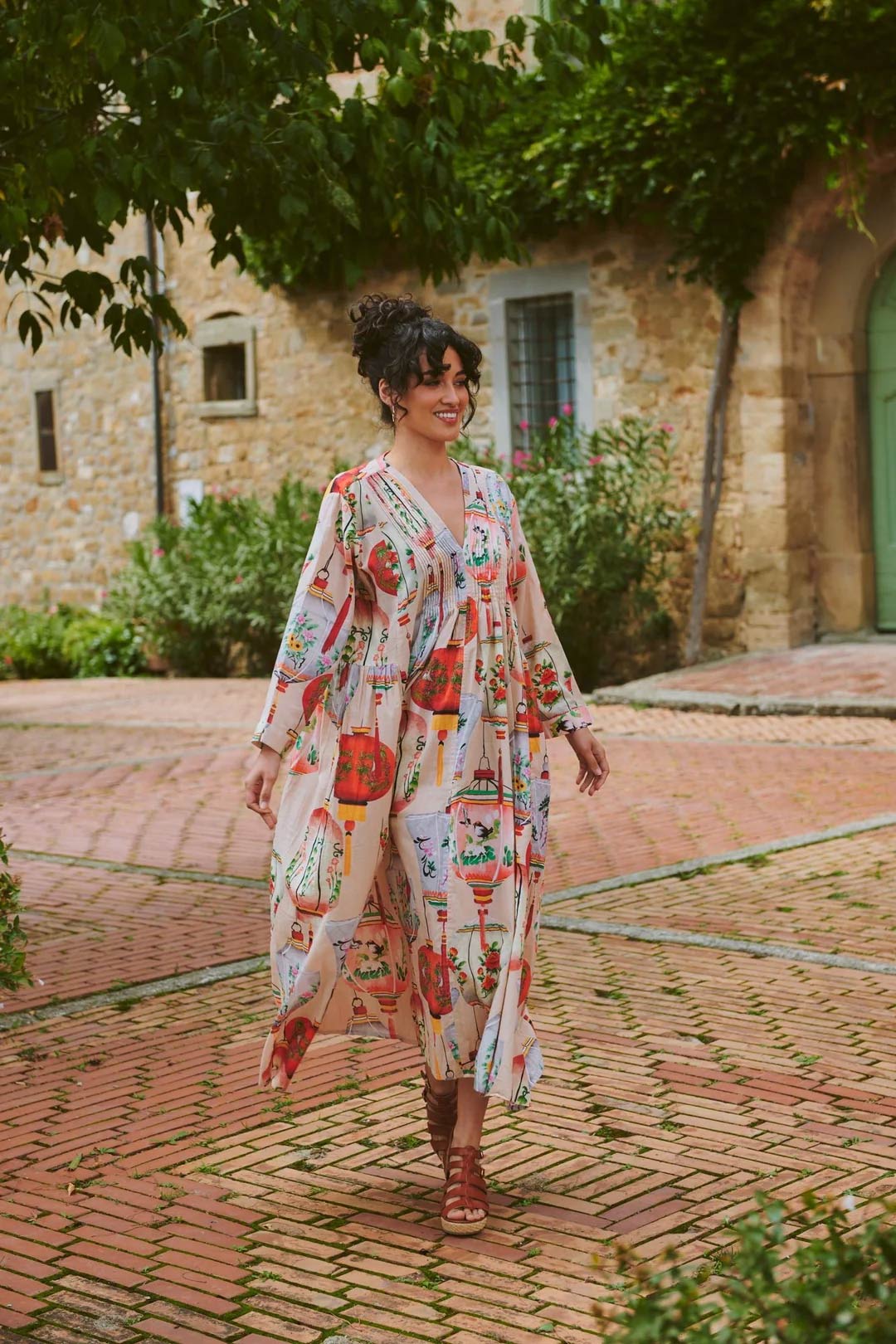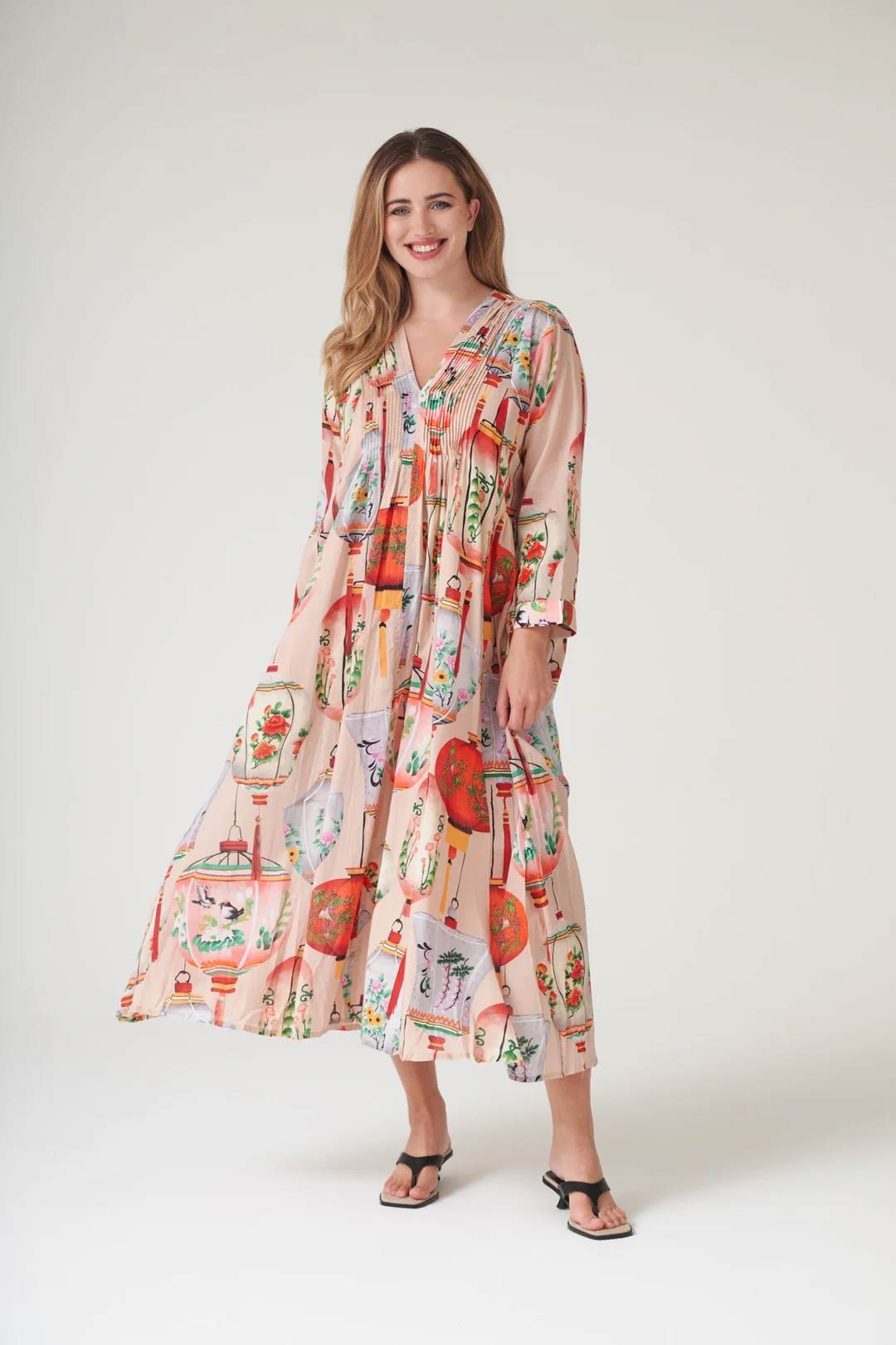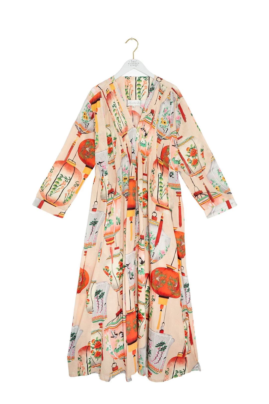 With its delicately pleated placket top leading down to a flowing maxi skirt, this dress showcases the entire One Hundred Stars signature print.