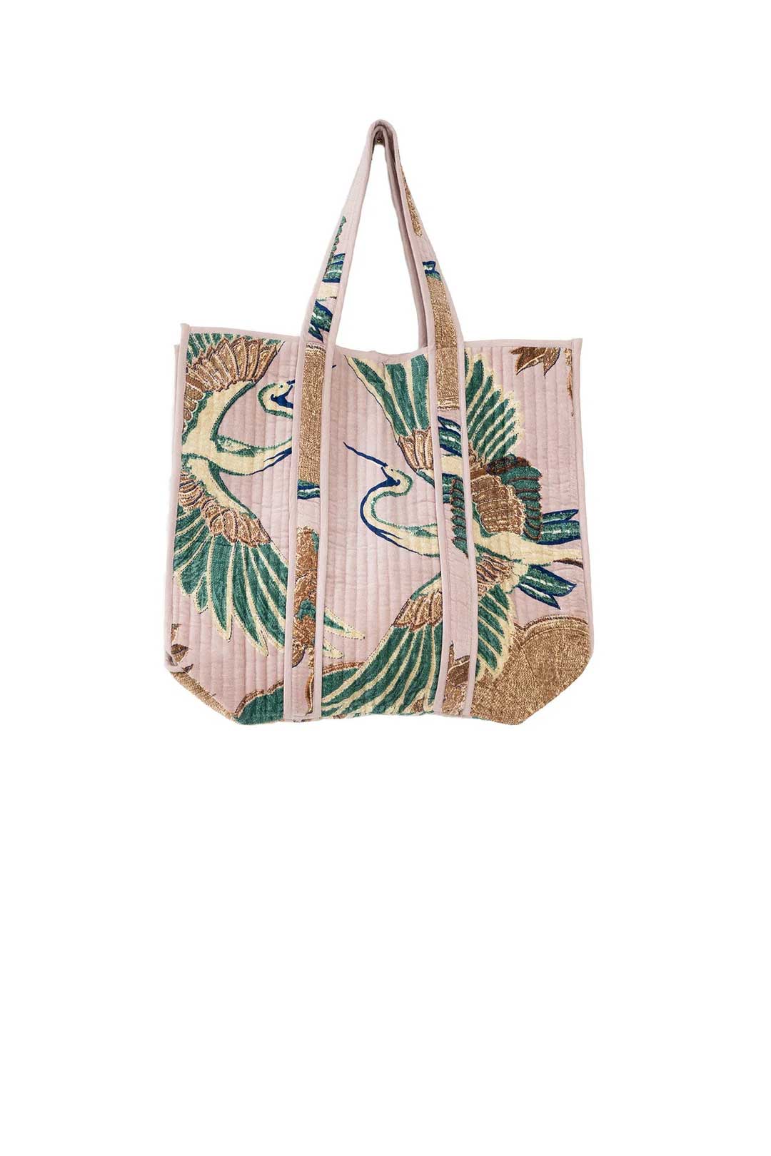 These large, graceful birds in jade, stone and camel colours fly across our signature plaster pink base.