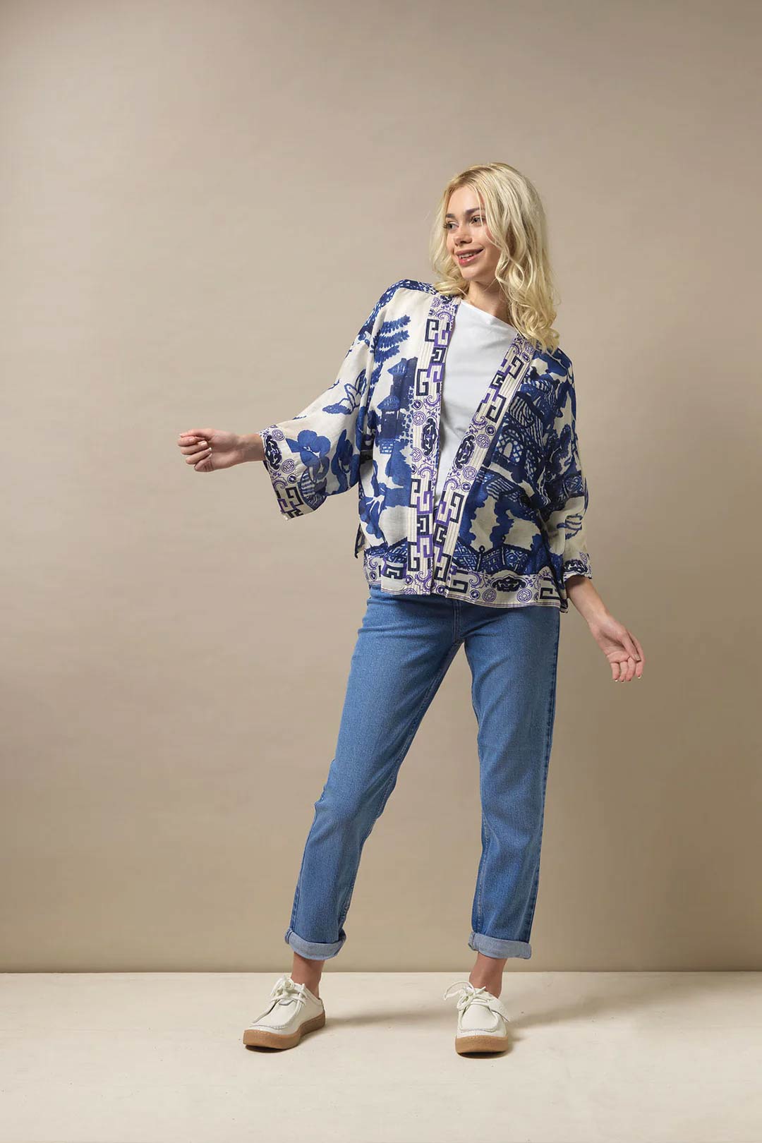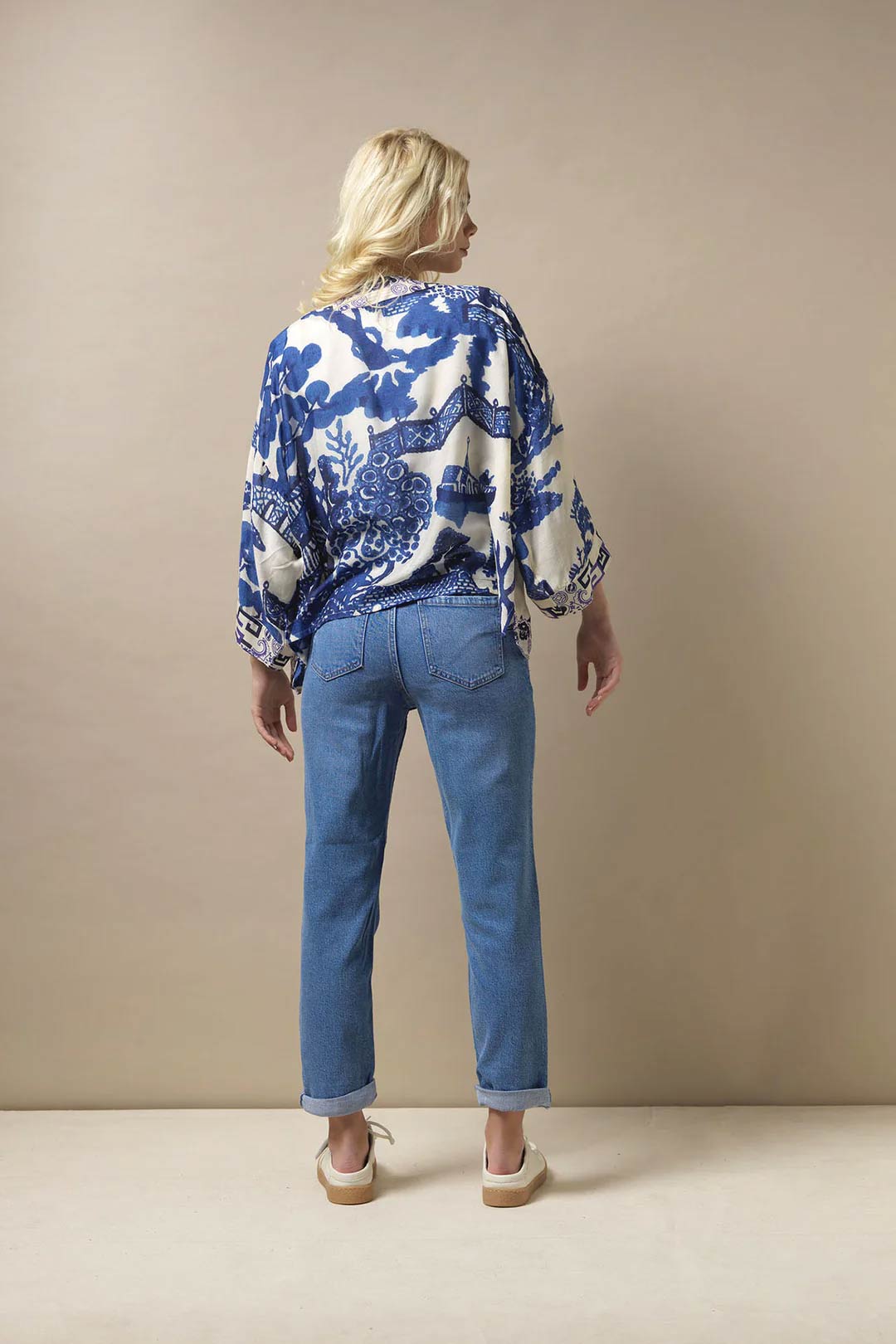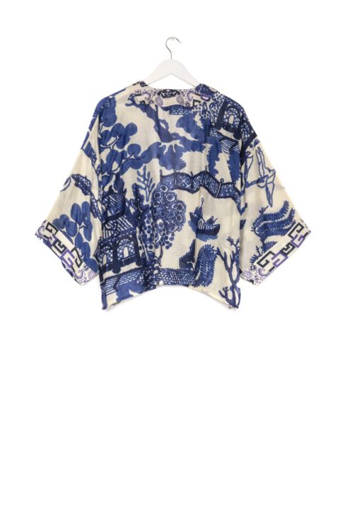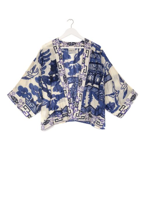 One Hundred Stars Giant Willow Kimono in Blue features the classic blue and white willow print which can often be found adorning vintage pottery.