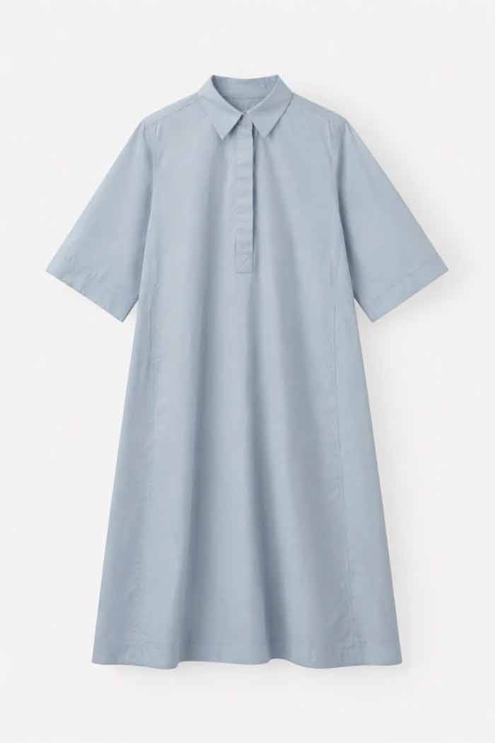 HARI is a relaxed shirt dress in our basic collection of organic cotton. The dress has collar, half button placket with hidden buttons and long sleeves. The sleeves are three quarter length. The dress has pockets in front seams and has an airy and comfy fit for everyday wear.