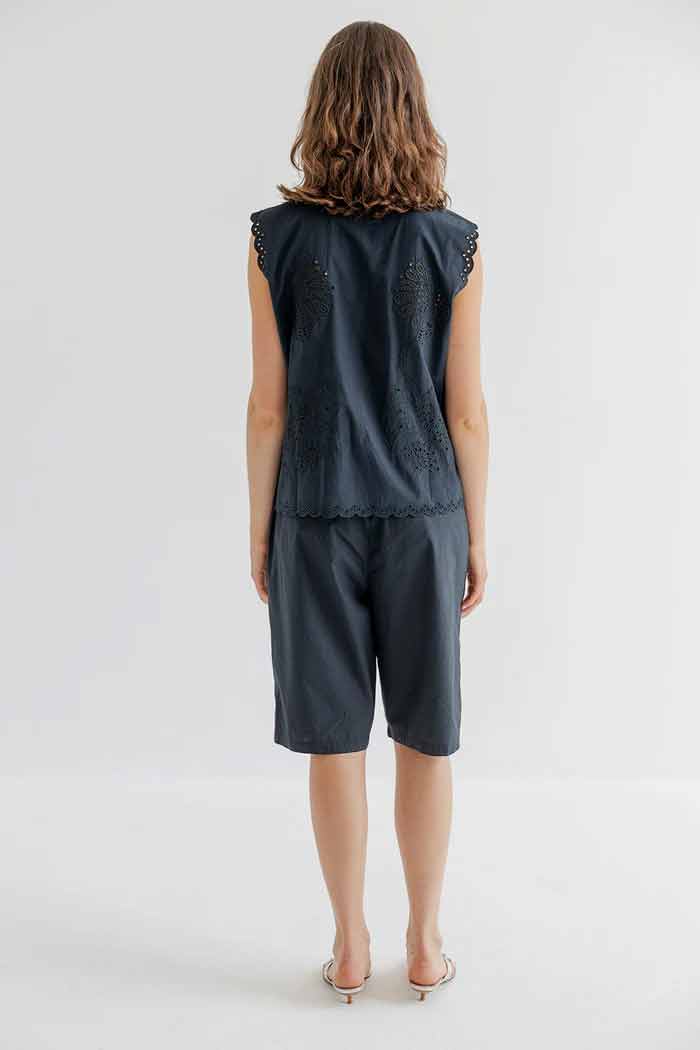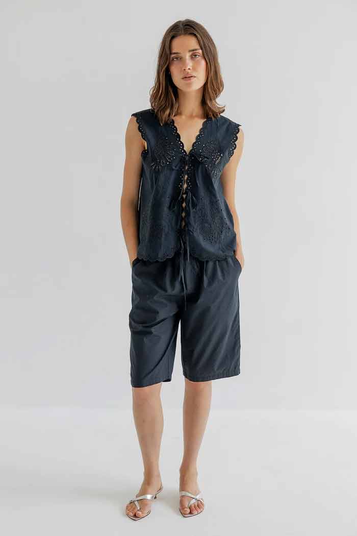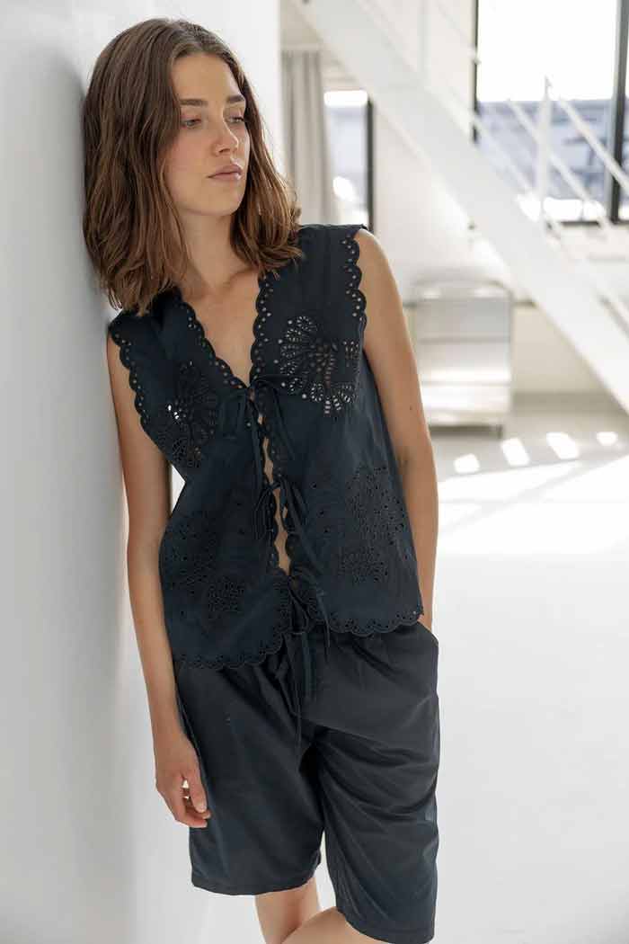 Hope is a lightweight top in our basic collection of organic cotton. The top has a sleeveless silhouette with a deep V-shaped neckline and delicate tie closures at the front. It features detailed embroidery throughout and scalloped edges that add a soft feminine finish. The fit is relaxed and airy, making it easy to style for everyday wear.